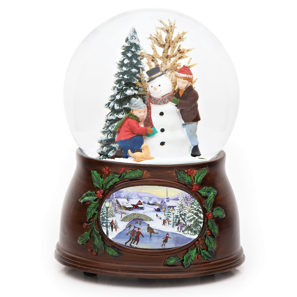 This charming snow globe features children happily building a snowman atop a rustic wood-look base. As snow gently swirls around them, the scene comes alive with joyful nostalgia and festive charm. Perfect for adding warmth and cheer to your holiday décor, this delightful piece captures the spirit of winter fun and seasonal magic, making it a wonderful addition to any festive display or thoughtful gift.