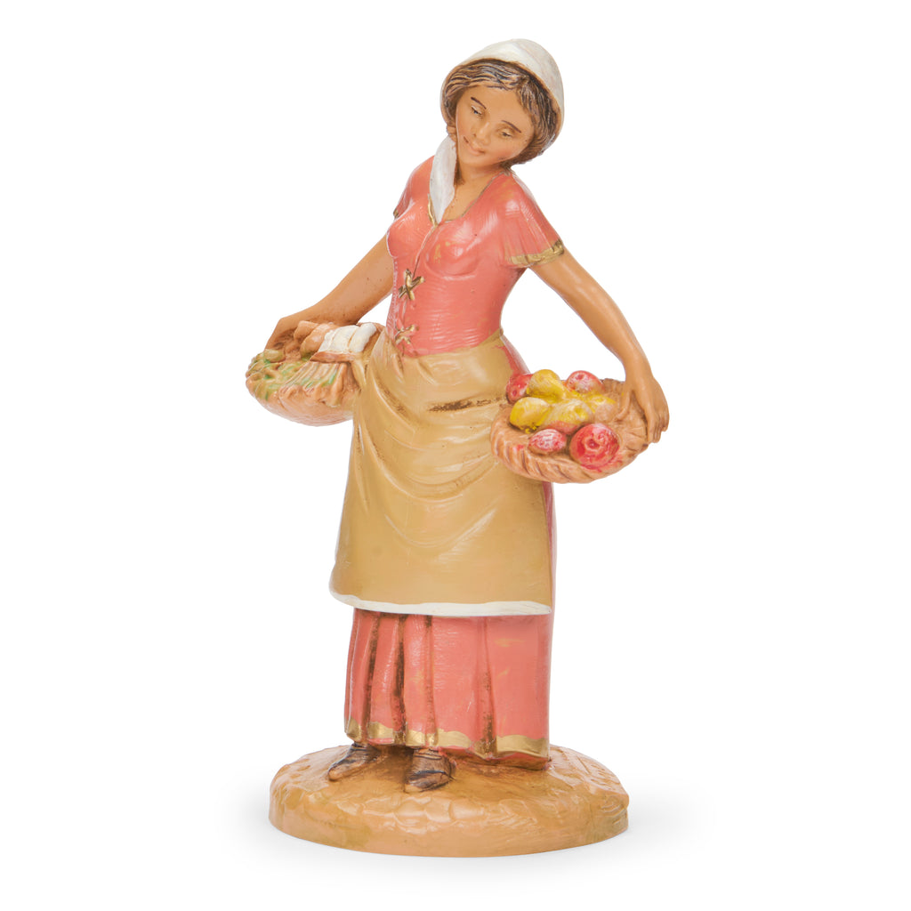 The 5" Scale Antonia the Produce Worker by Fontanini adds a touch of realism and motion to your nativity village. Shown holding two baskets full of vegetables, fruit, and bread, Antonia appears mid-stride, actively contributing to daily life. She is dressed in a warm red blouse and tan apron, with sculpted detailing throughout the goods she carries.
