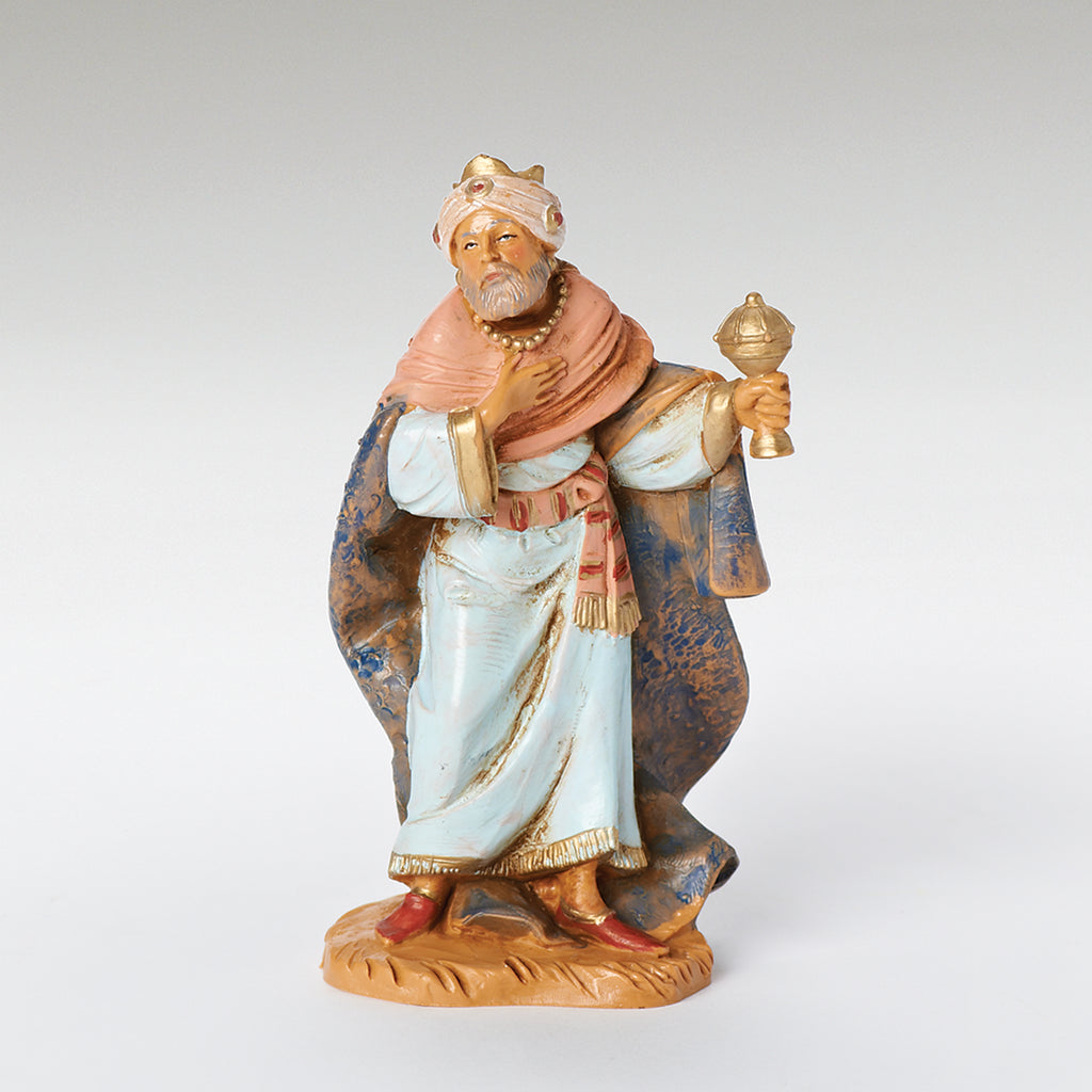 Gaspar captures the moment of a king bringing his gift before the newborn Christ. Dressed in a flowing white robe with gold trim, a coral sash, and a sculpted turban, Gaspar carries one of the most meaningful gifts of the nativity story‚ symbolizing worship and the divine nature of the newborn King.