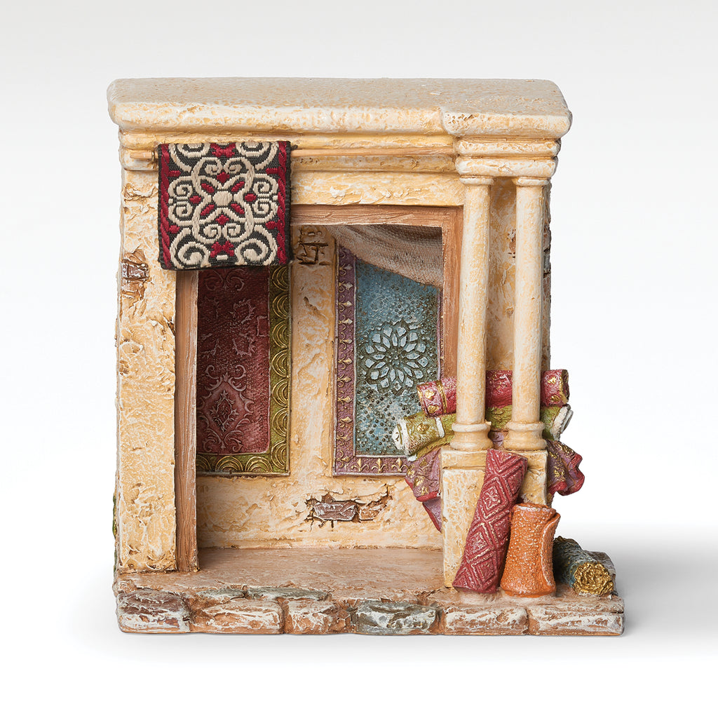 Detailed with rolled carpets, patterned textiles, and a stone-like façade, this shop scene adds depth and authenticity to your nativity village. Decorative rugs drape over the entryway and walls, drawing the eye to the vibrant colors within. This piece pairs perfectly with the Rug Merchant figure, creating a complete vignette that brings the bustling markets of Bethlehem to life.