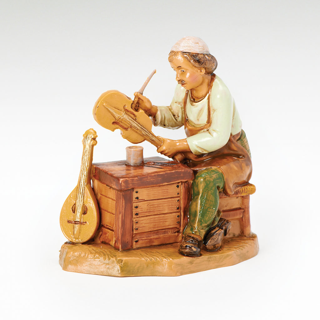 Zimri the Instrument Maker shows a skilled artisan carving a stringed instrument with care at his workbench. A finished mandolin rests beside him, his expression reflecting quiet concentration and love for his craft. Known for teaching children and gifting instruments, Zimri brought joy to Bethlehem, welcoming the Christ Child.