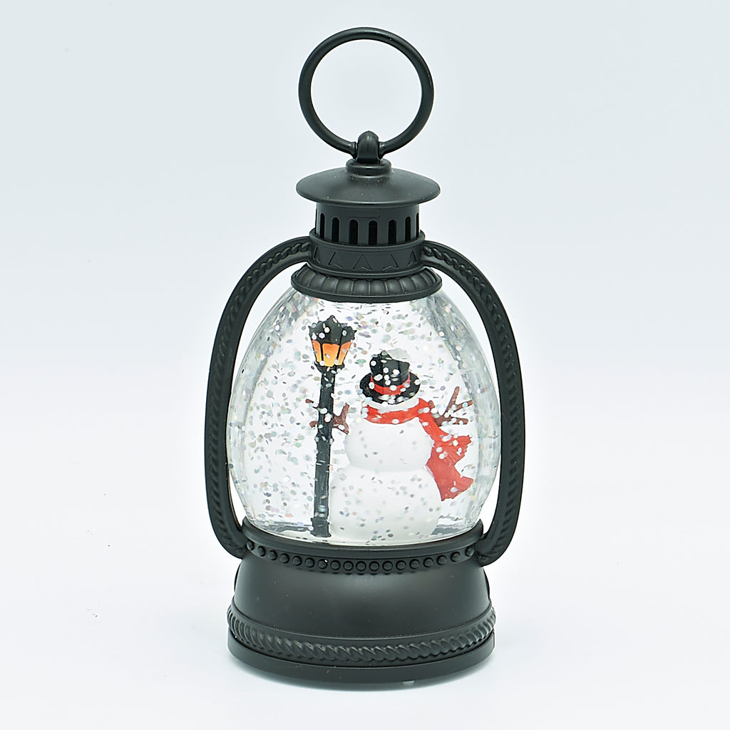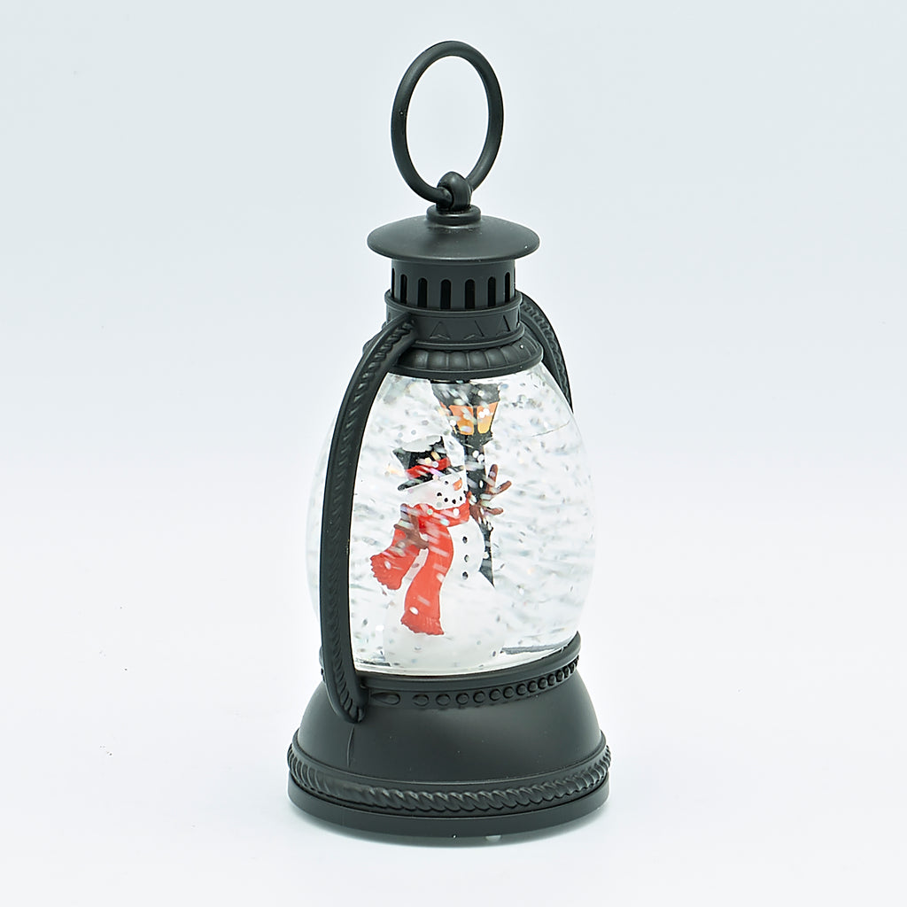 Bring the joy of winter indoors with this classic black lantern featuring a cheerful snowman standing beside a glowing lamppost. Surrounded by swirling shimmer, the scene captures the magic of a snowy evening, filling your home with festive warmth and charm. Perfect for mantels, tabletops, or seasonal displays, it’s a timeless accent that brightens any holiday space.