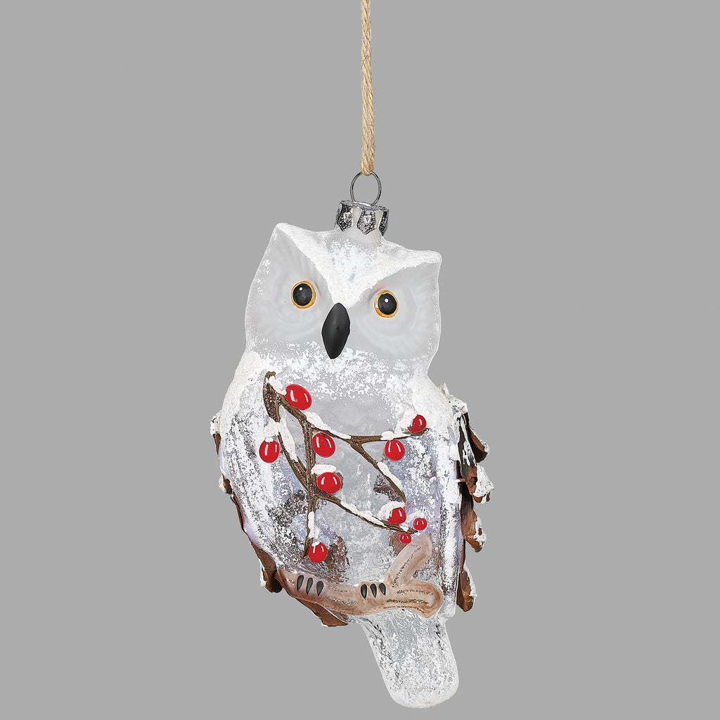 Add woodland wonder to your Christmas tree with this elegant white owl ornament. Accented with bright red winter berries and shimmering frosted details, it captures the beauty of the season with rustic charm and festive sparkle. A perfect accent piece that brings both nature-inspired warmth and holiday elegance to your décor.