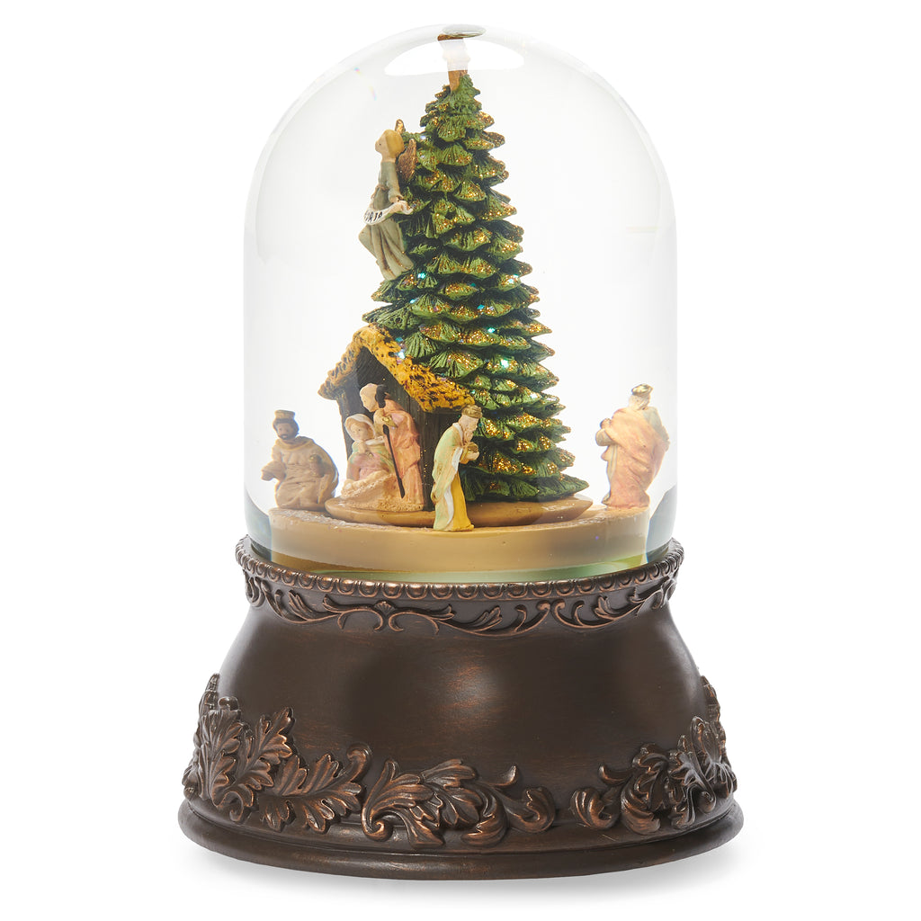 This rotating musical waterglobe from Fontanini beautifully captures the Holy Family within a stable scene, surrounded by the Three Kings and crowned by a Christmas tree topped with a shining star. Glitter swirls inside the dome with a gentle shake, bringing motion and sparkle to the Nativity. Resting on a bronze-look base with ornate detailing, it blends elegance with devotion, making it a treasured piece for the season.