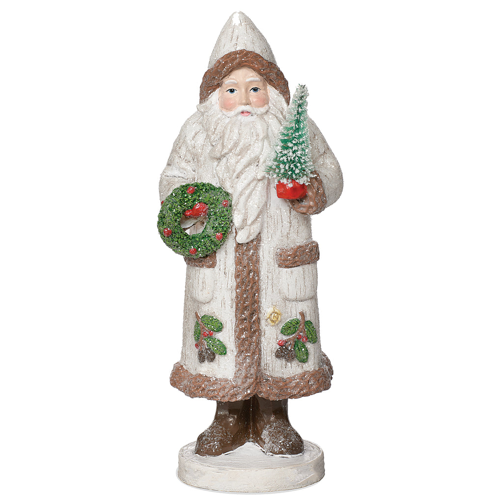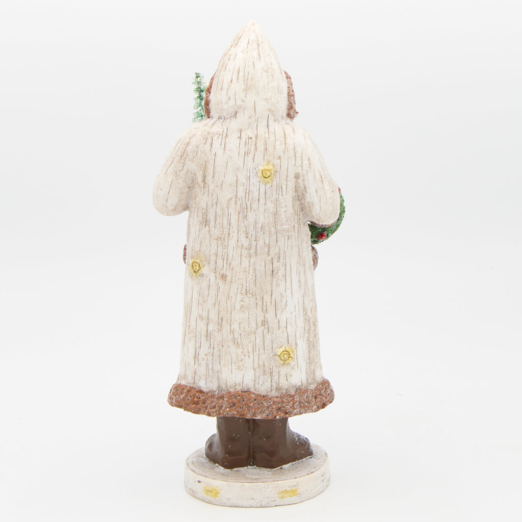 Celebrate the season with this Santa figure, dressed in a birch-textured coat accented with holly and pinecone details. Holding a wreath and a miniature tree, he brings rustic charm and festive warmth to mantels, shelves, or tabletop displays.