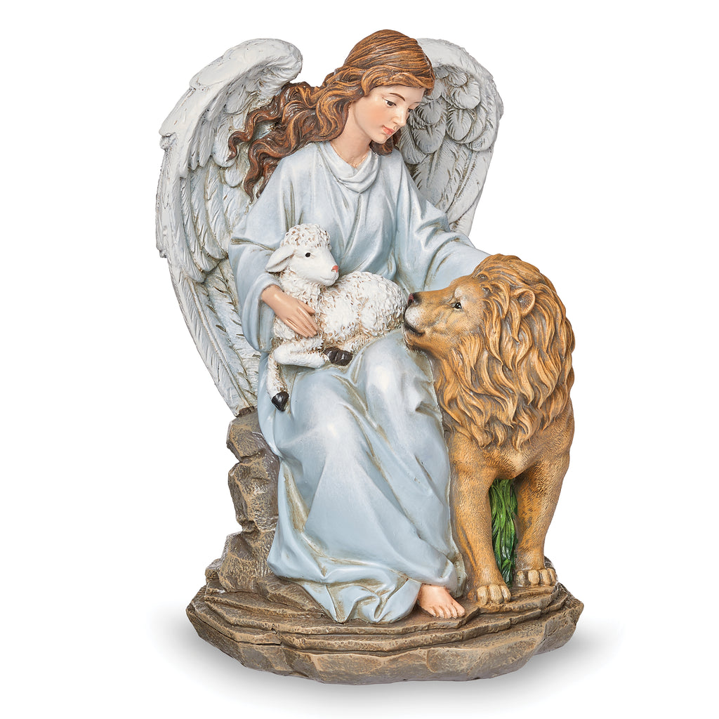 This beautifully crafted angel figure gently rests her hands near a lion and lamb, capturing a powerful image of peace and unity. With soft detailing and symbolic presence, it's ideal for mantels, shelves, or as a heartfelt gift of faith and encouragement.