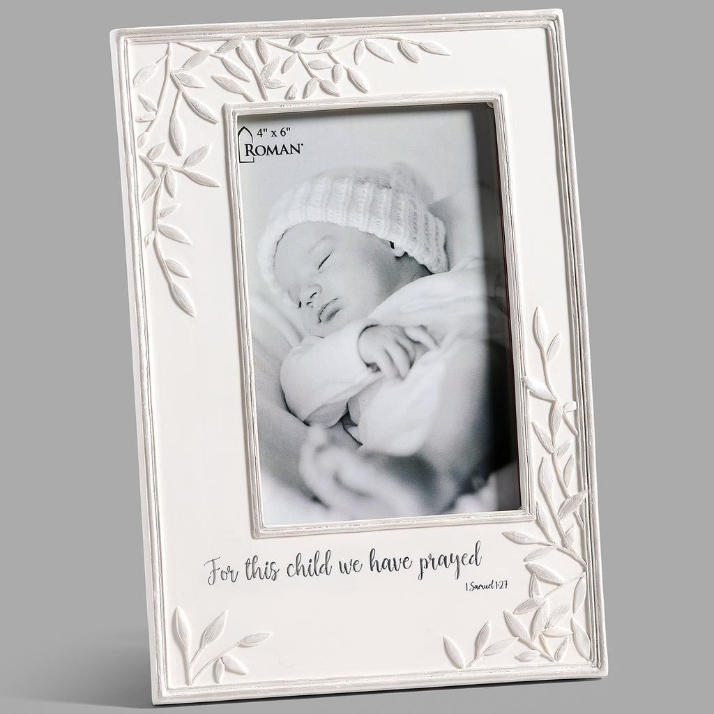 This meaningful photo frame is a beautiful way to celebrate the joy of new life and answered prayer. Featuring the beloved scripture “For this child we have prayed” (1 Samuel 1:27), it provides a place of honor for your most treasured photo. Raised leaf accents gracefully climb the border, symbolizing growth, blessing, and the beauty of family. With both horizontal and vertical display options, this frame makes a thoughtful gift for baptisms, baby showers, or new parents. A heartfelt keepsake to cherish for years to come.