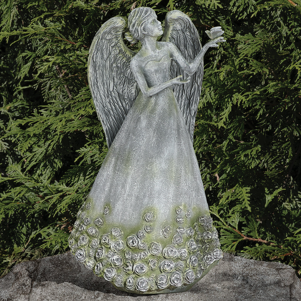 The Angel with Rose Skirt and Dove Garden Statue brings a calming presence to your outdoor space. Designed with finely detailed wings and a flowing gown adorned with sculpted roses, this elegant figure gently holds a dove, symbolizing peace and love. Perfect for gardens, patios, or remembrance areas, it adds both beauty and meaning to any setting.