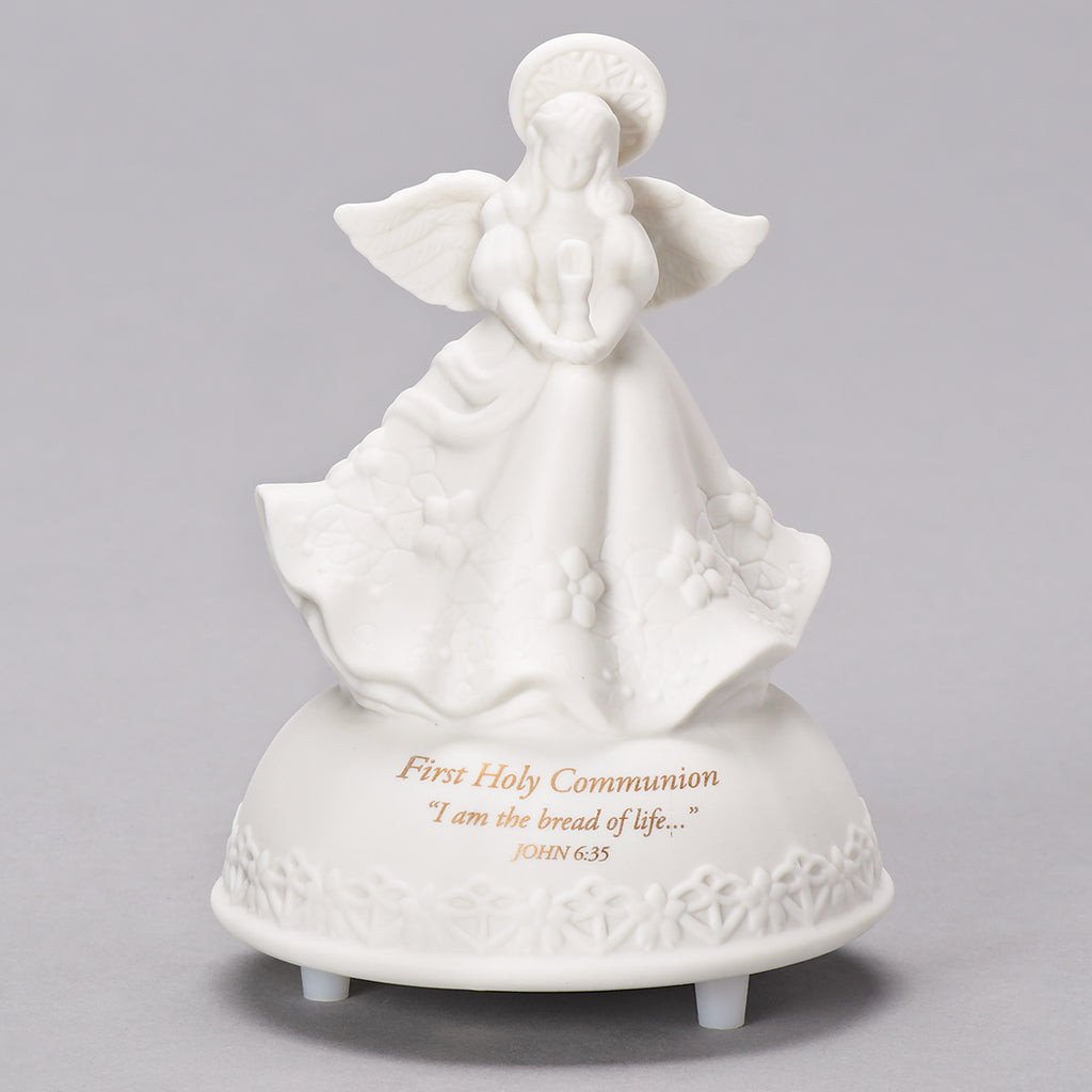 This porcelain angel figurine captures the sacred beauty of First Communion with grace and reverence. The angel stands with gentle wings extended, holding a chalice close as a symbol of the Holy Sacrament. At the base, the words of John 6:35 remind us of Christ’s promise: “I am the bread of life”. Crafted with delicate floral detailing and an elegant finish, this keepsake is both a meaningful symbol of faith and a lasting memento of a cherished milestone. Wind it up to hear its gentle melody, adding an extra touch of devotion to the moment.