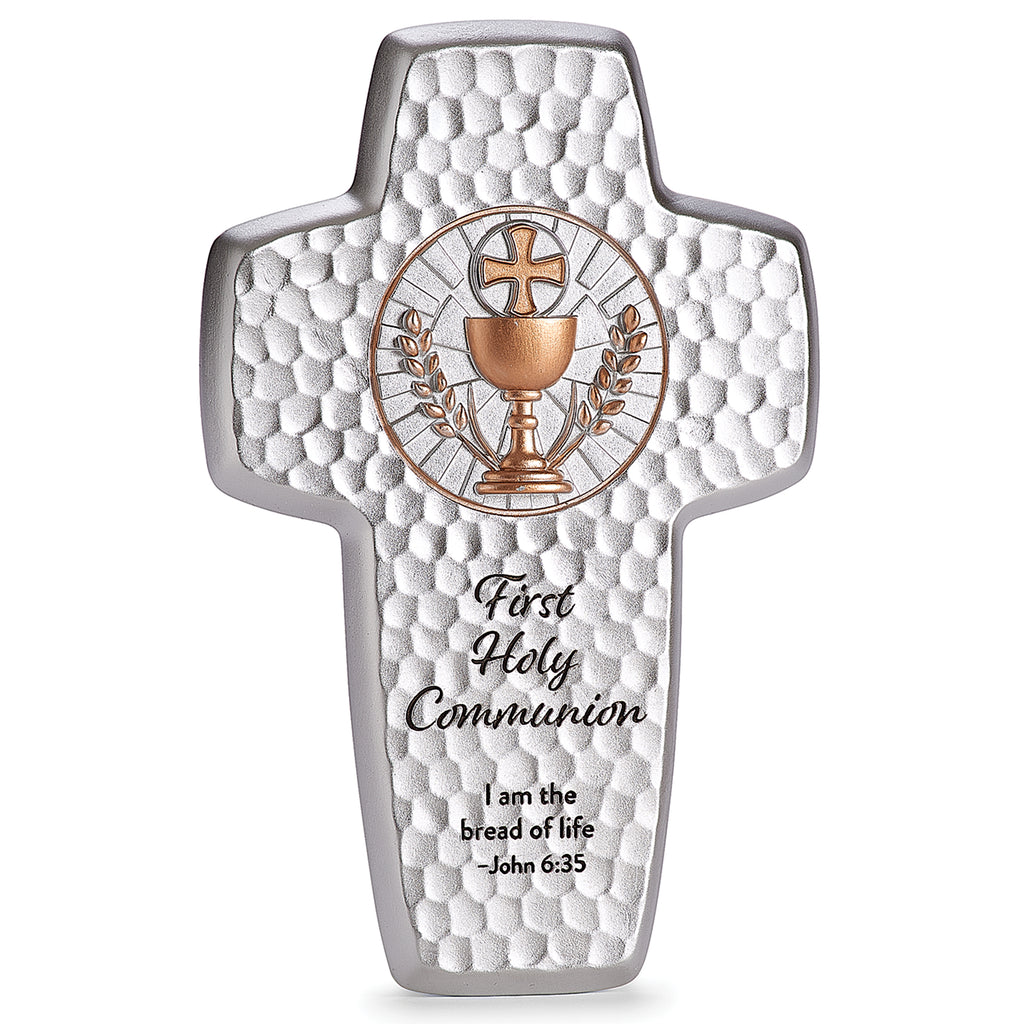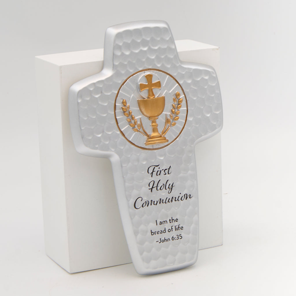 This striking First Communion wall cross features a hammered silver texture that gives it a handcrafted look, accented with a radiant chalice and host emblem at the center. Below the emblem is the cherished verse from John 6:35: “I am the bread of life”. A meaningful keepsake, this cross serves as both a symbol of faith and a reminder of the sacred promise celebrated on First Communion Day. Its bold design makes it a unique and lasting gift that will be treasured for years.