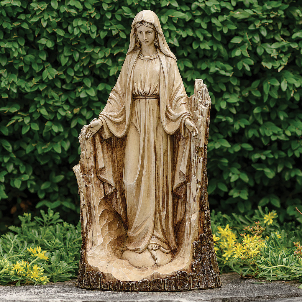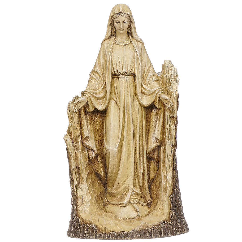 This Carved-Look Lady of Grace Garden Statue features elegant detail and a peaceful expression. Designed in a carved-stone style and made from weather-resistant materials, it's perfect for outdoor prayer gardens, patios, or Marian devotionals.
