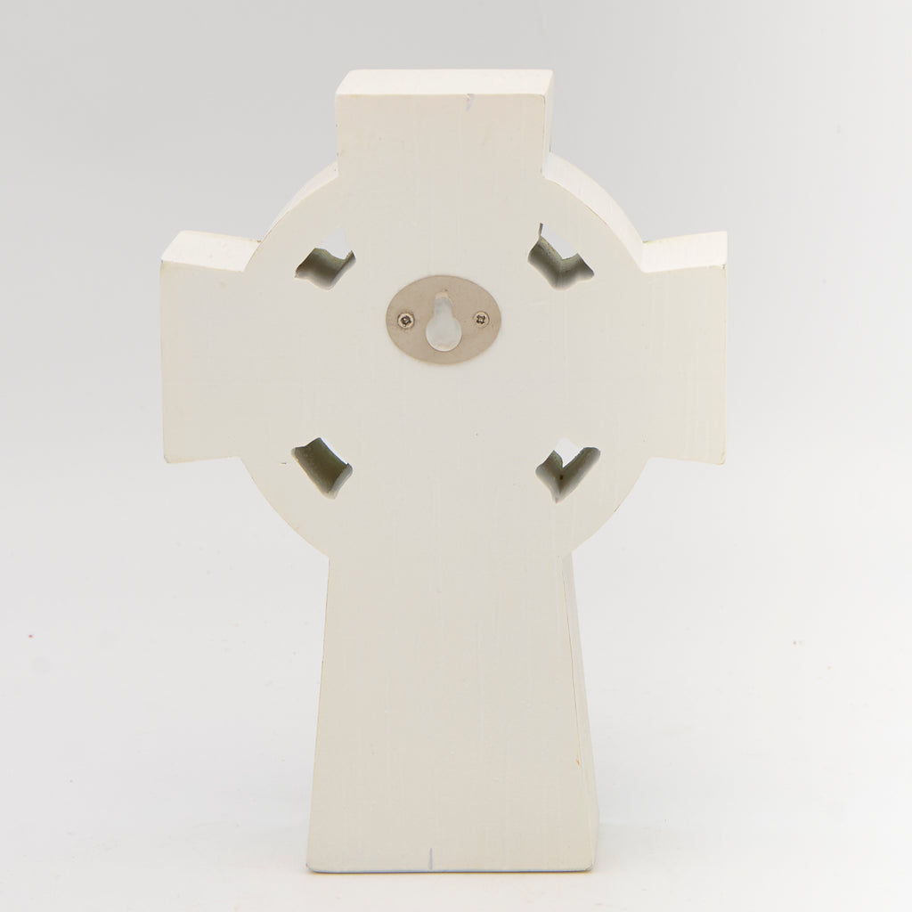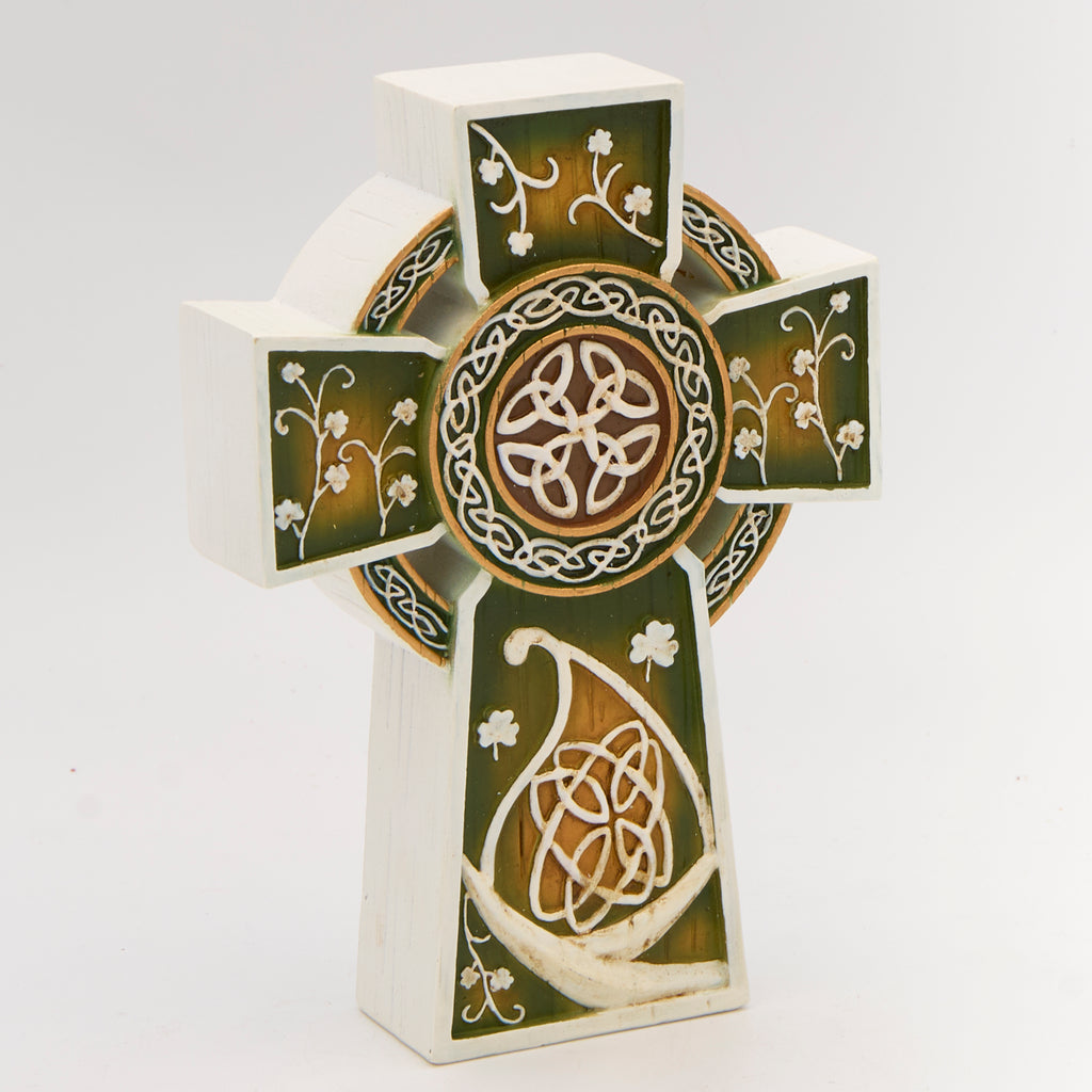 This beautifully detailed tabletop cross features a hand-carved woodcut design accented with Celtic knotwork and shamrock motifs. Finished in warm green and natural wood tones, it brings a touch of Irish heritage and faith to any space. Perfect for mantels, prayer corners, or as a meaningful gift of inspiration.