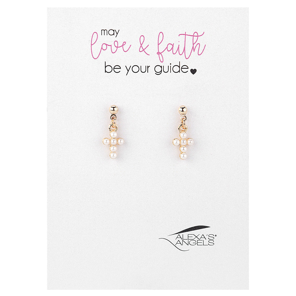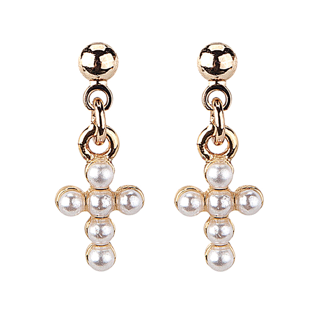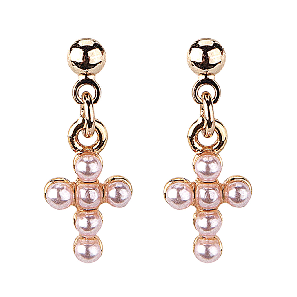 Delicate and meaningful, these earrings feature petite cross charms adorned with luminous faux pearls. Set on a gold-tone base, they make a beautiful accessory for baptisms, first communions, confirmations, or as a cherished keepsake gift for a young believer.