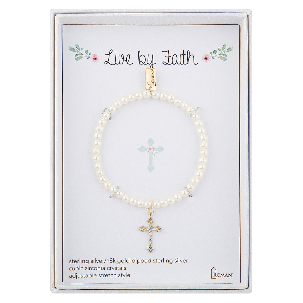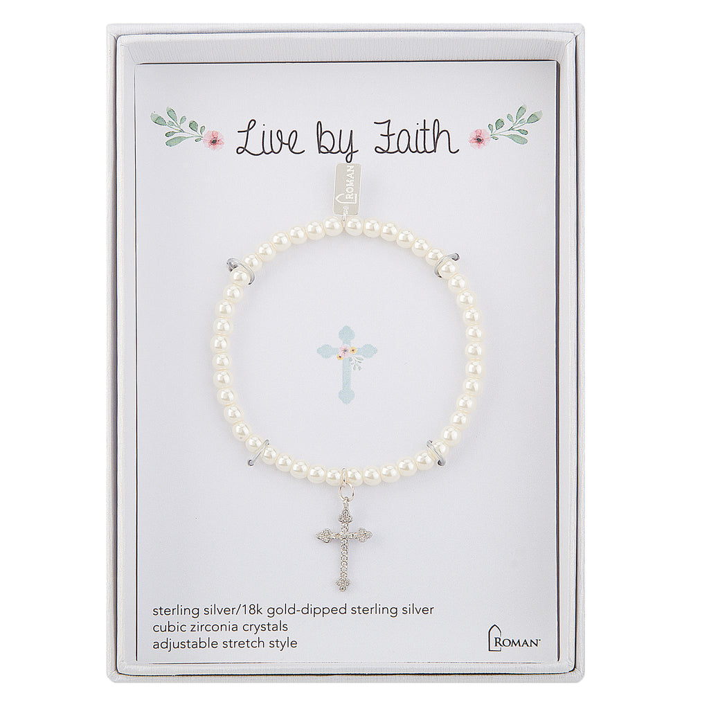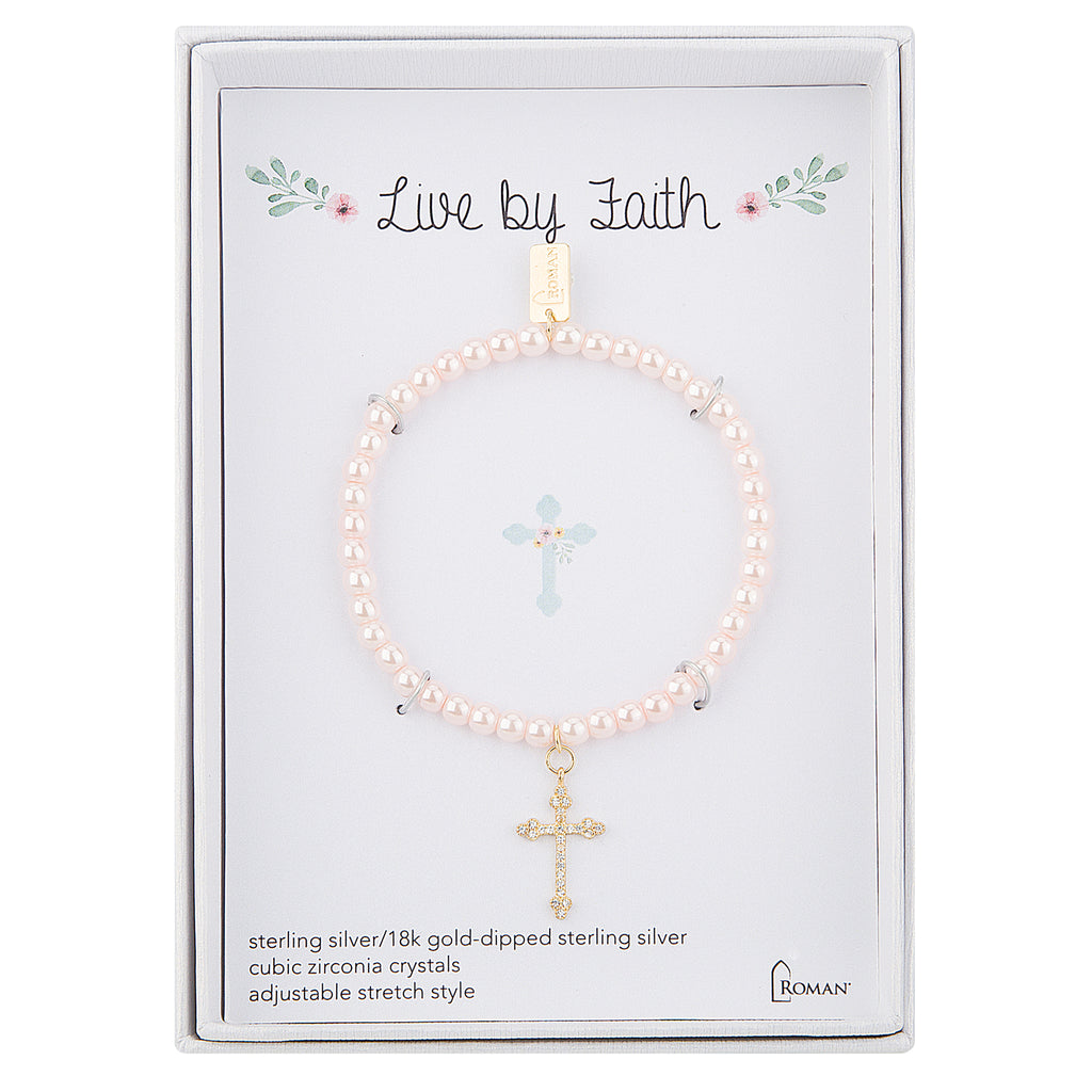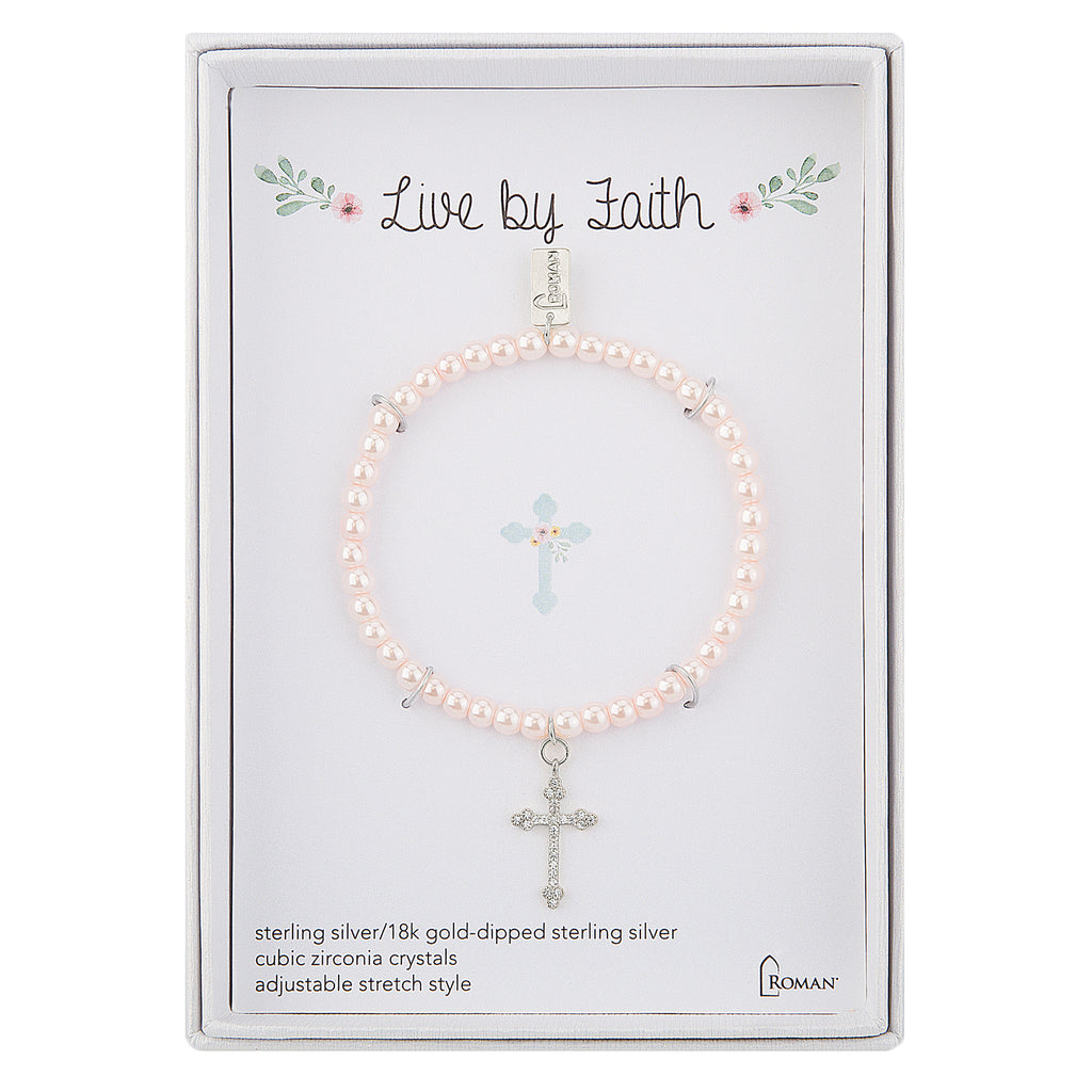 This children’s stretch bracelet features glossy faux pearls accented with a sparkling cross charm. Available in white or pink and thoughtfully sized for smaller wrists, it comes beautifully presented in a gift box. A meaningful accessory for First Communion, Baptism, or everyday expressions of faith.