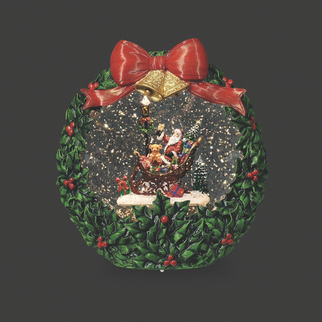 This lighted swirl wreath features Santa riding in his sleigh beneath a classic lamppost, surrounded by festive greenery and a red bow accent. Continuous swirling glitter creates the look of gently falling snow, illuminated by warm white light for added depth and sparkle. The detailed holly leaves and gold bell enhance its traditional Christmas charm.
