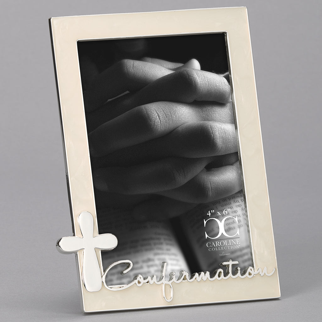 Celebrate the meaningful milestone of Confirmation with this elegant Caroline Collection frame. Designed with a luminous silver-tone finish, it features a smooth ivory border accented by a simple cross and the word “Confirmation” in graceful script across the bottom. The understated design highlights the significance of the sacrament while offering a timeless way to display a treasured photo. A thoughtful keepsake, it beautifully blends faith and memory into a piece that will be cherished for years to come.