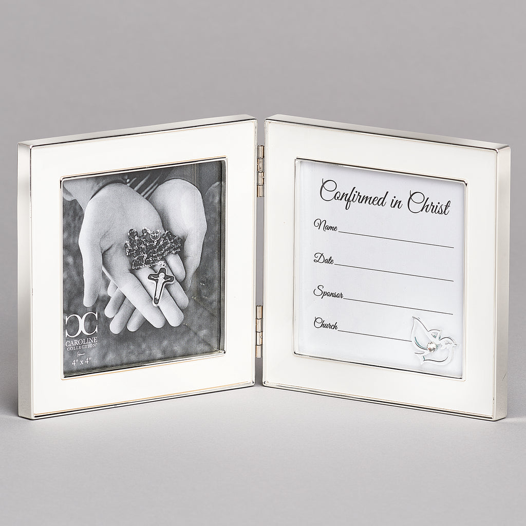 This keepsake frame from the Caroline Collection is designed to capture both the joy and significance of Confirmation day. On one side, there is space for a treasured photograph that reflects the moment, while the opposite side holds a certificate insert where the name, date, sponsor, and church can be recorded.