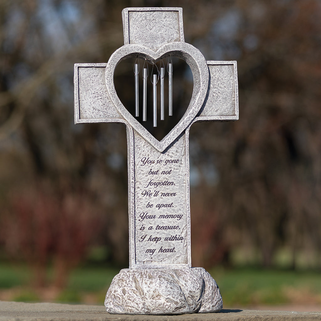 Create a place of peace and remembrance with this beautifully designed memorial garden chime. Shaped as a cross with a heart-shaped opening, it features a heartfelt inscription and metal tubes that produce soft, calming tones in the breeze. With its weathered stone-like finish, this tribute serves as a meaningful addition to gardens, patios, or memorial spaces, offering comfort and reflection.