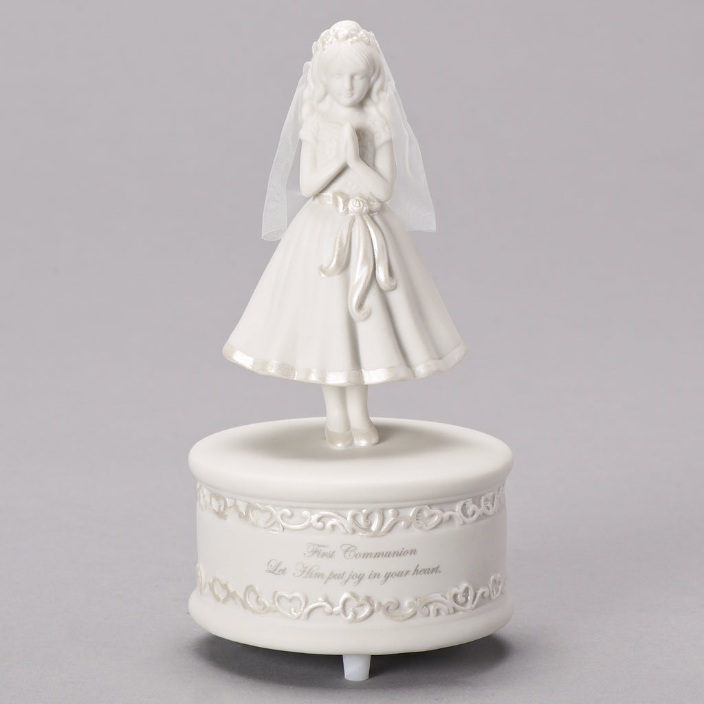 This elegant First Communion musical figurine captures the innocence and devotion of a young girl on her special day. Dressed in a flowing white dress with delicate detailing, she stands with hands folded in prayer, her veil softly draped over her shoulders. The base features a heart and vine design with the words, “First Communion – Let Him put joy in your heart,” making it a meaningful keepsake. As the music plays, the figurine becomes a beautiful reminder of faith, purity, and the joy of receiving the sacrament. A treasured gift that will be cherished for years to come.