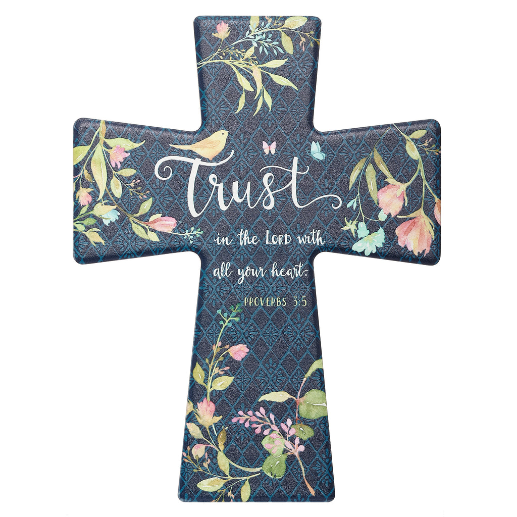 This beautifully crafted ceramic cross features a rich navy background adorned with delicate floral art and a charming bird illustration by Rebecca Canale. Emblazoned with Proverbs 3:5, it gently reminds us to "Trust in the Lord with all your heart". A perfect tabletop piece for daily encouragement, it brings warmth and spiritual grace to any space.