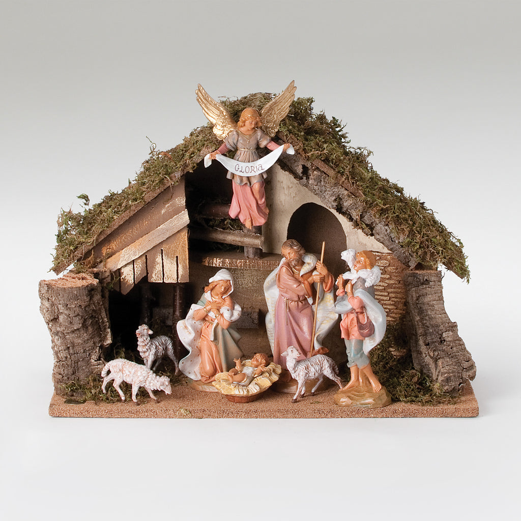 This Fontanini nativity brings depth and storytelling to the heart of Christmas. The Holy Family is surrounded by an angel, a shepherd, and three gentle sheep, each figure positioned with lifelike movement and purpose. Set within a hand-crafted Italian stable made from natural materials, the scene reflects the humble beauty of that first night in Bethlehem. A remarkable keepsake that celebrates faith, tradition, and the enduring message of peace.