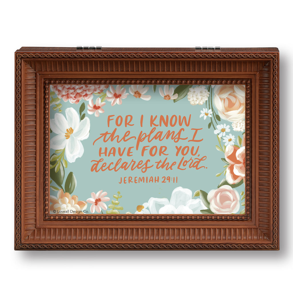 From our Loveall Collection, this large brown music box offers a meaningful expression of faith and encouragement. The lid features a floral-framed verse from Jeremiah 29:11“For I know the plans I have for you.” A thoughtful keepsake for milestones, sympathy, or as a lasting reminder of God’s promises and hope for the future.