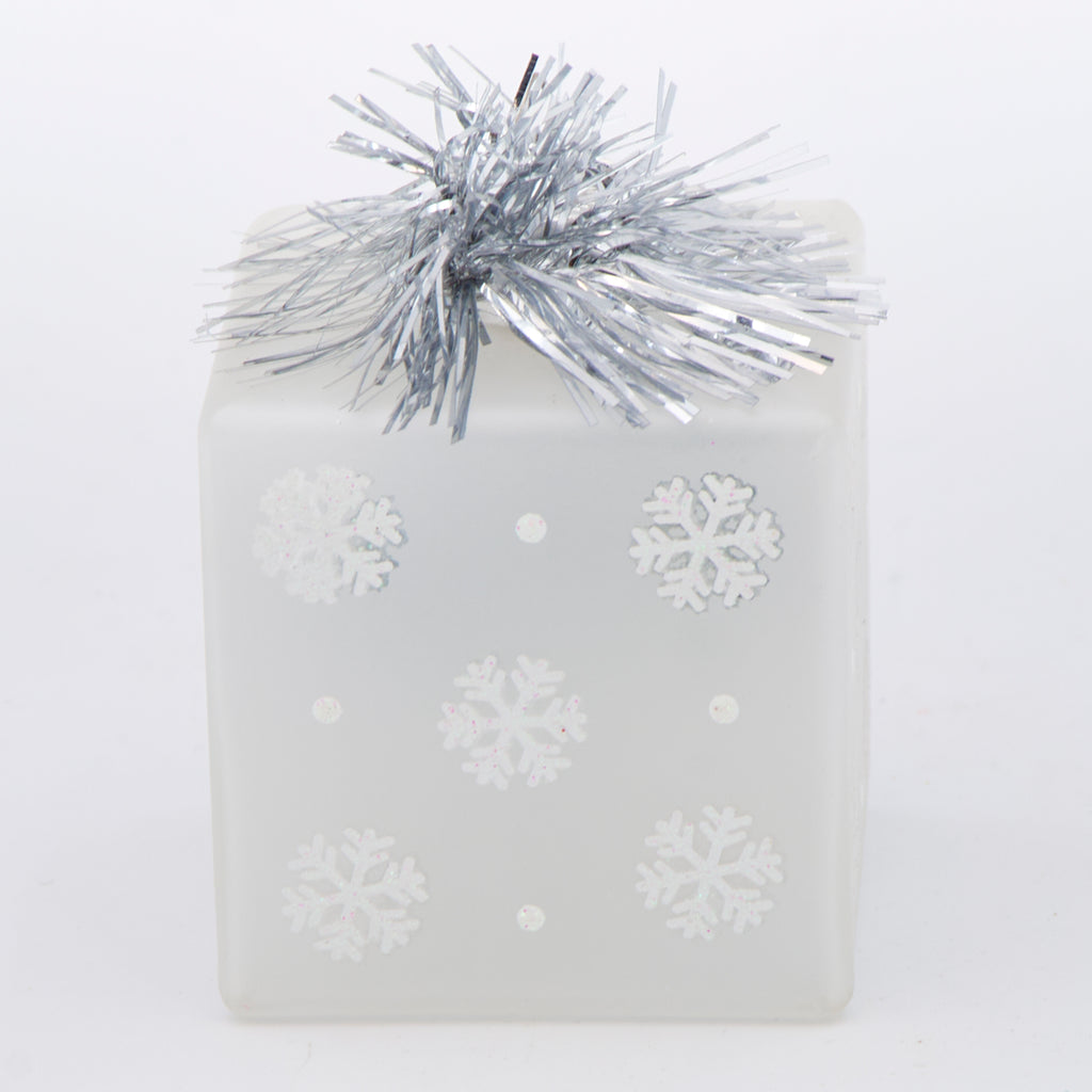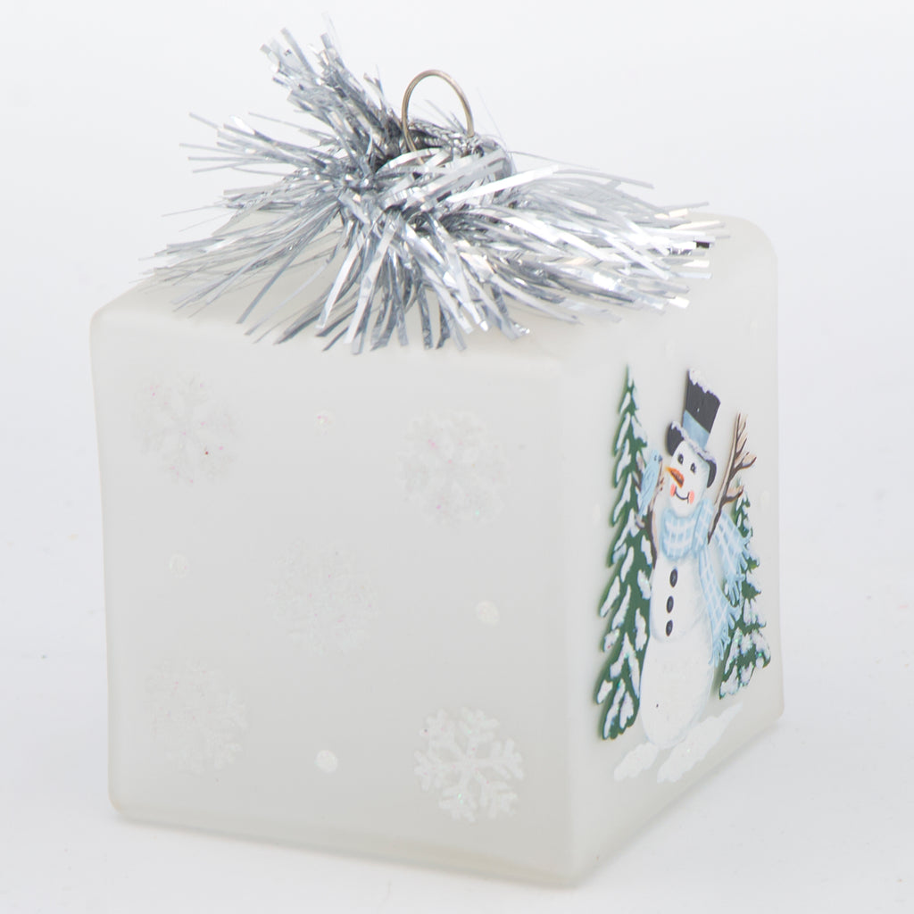 Enhance your holiday decor with this charming frosted glass ornament, showcasing a whimsical snowman nestled inside a clear cube and adorned with a vibrant blue scarf. Its playful design brings a fresh, modern touch to traditional tree decorations and makes a delightful gift or stocking stuffer, adding a cheerful pop of wintery charm to any festive setting.