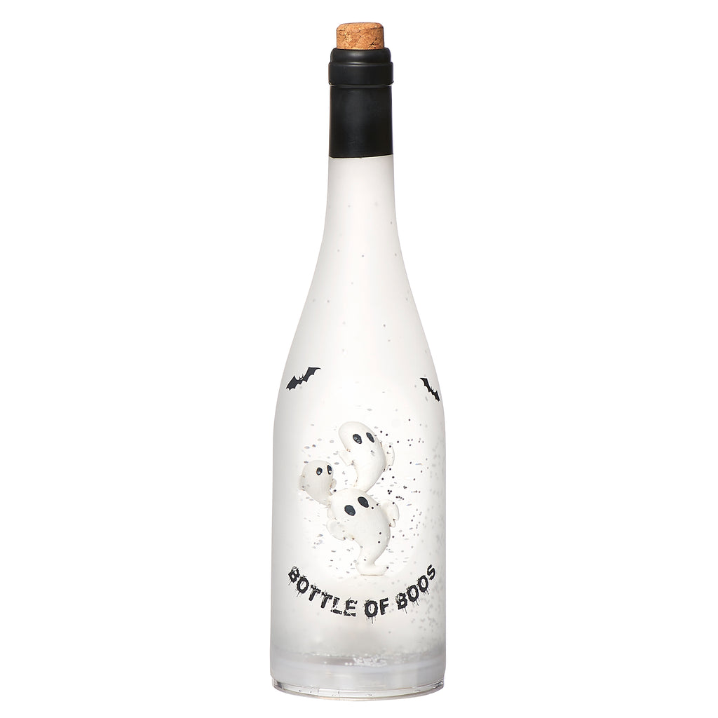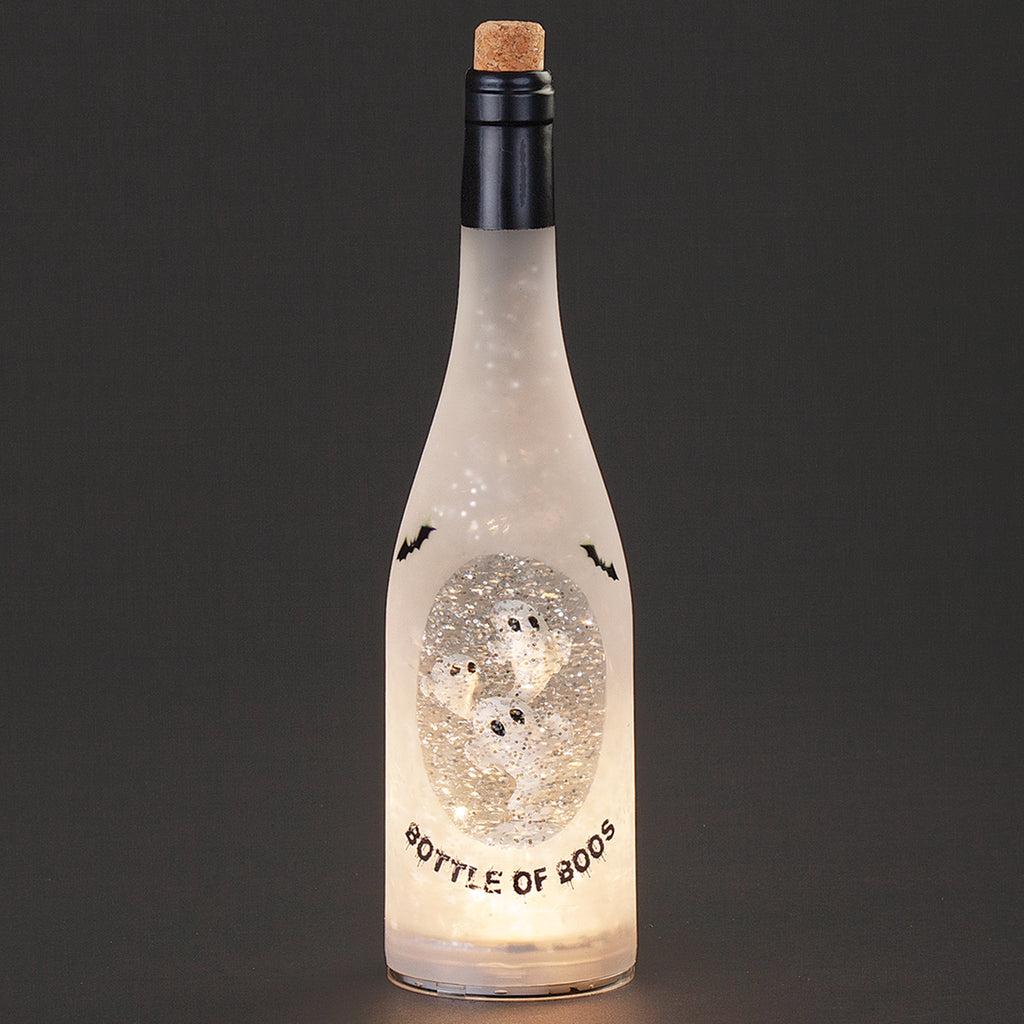 Add ghostly charm to your Halloween décor with this frosted swirl bottle. Featuring cheerful ghosts and the playful phrase “Bottle of Boos,” it's the perfect mix of cute and spooky. Swirling glitter and a soft internal glow make it a fun accent for bars, shelves, or festive party displays.