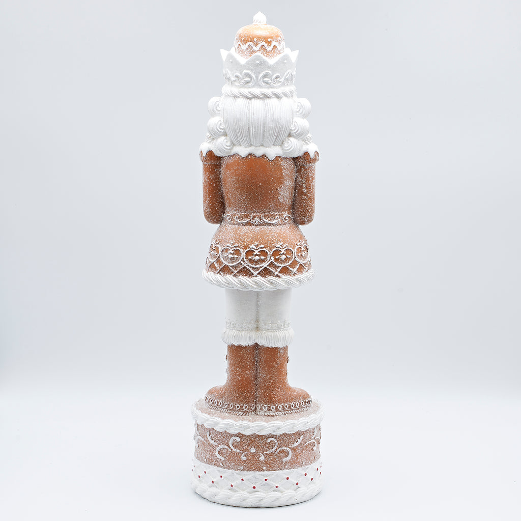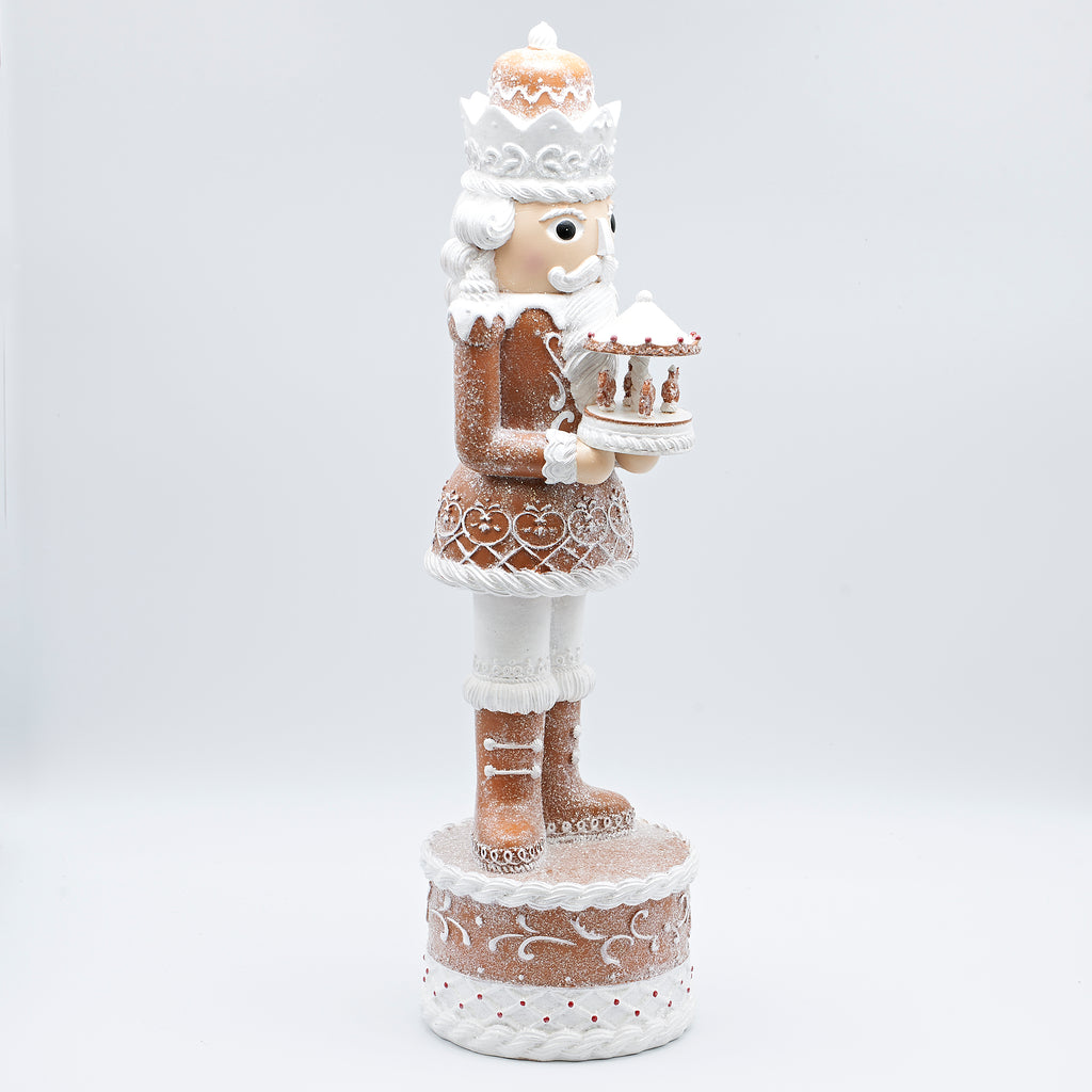 Make a bold seasonal statement with this gingerbread nutcracker, designed with icing-like details and candy-inspired accents. He holds a whimsical carousel, adding a touch of playful charm to his stately form. A perfect blend of old-world tradition and festive fun, this piece is ideal for entryways, mantels, or as a standout focal point in your holiday décor.