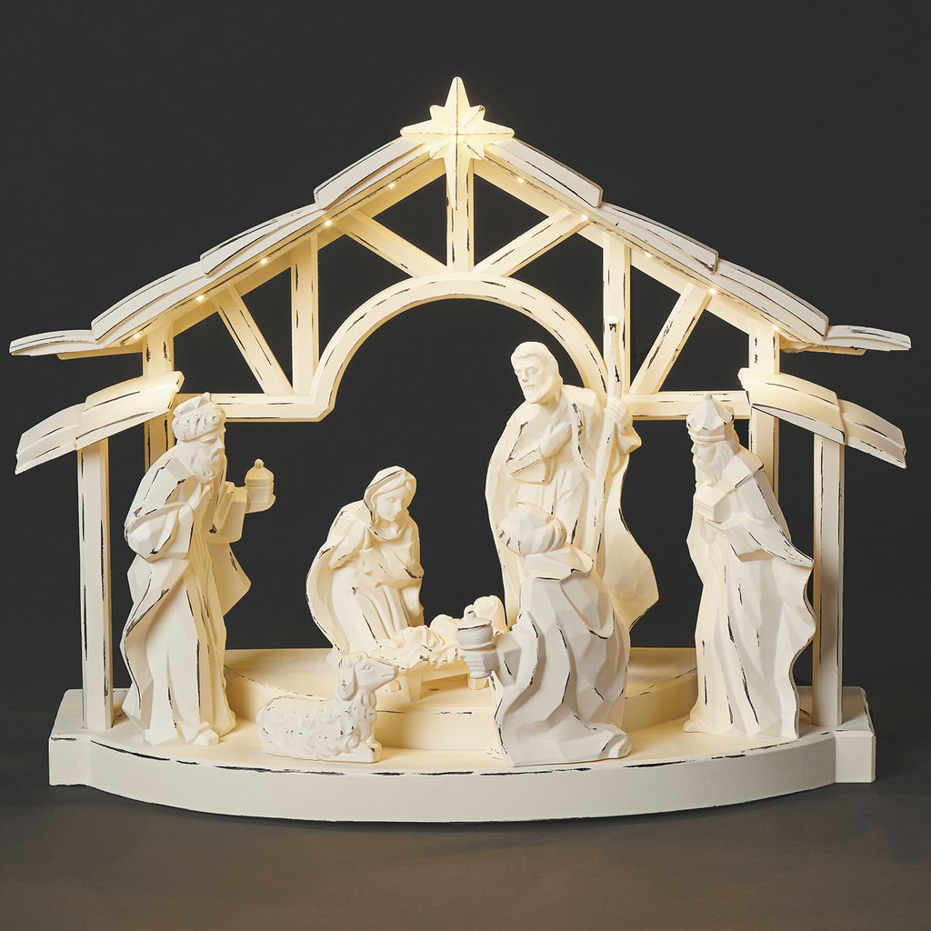 This serene nativity display is sculpted from acrylic, featuring the Holy Family, Three Wise Men, and animals beneath a glowing, open-style stable. Clean lines and soft internal lighting highlight each figure, while the arched structure adds height and elegance. A beautiful way to bring calm and light into your Christmas setting.
