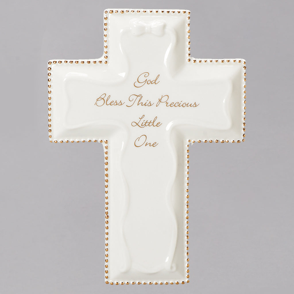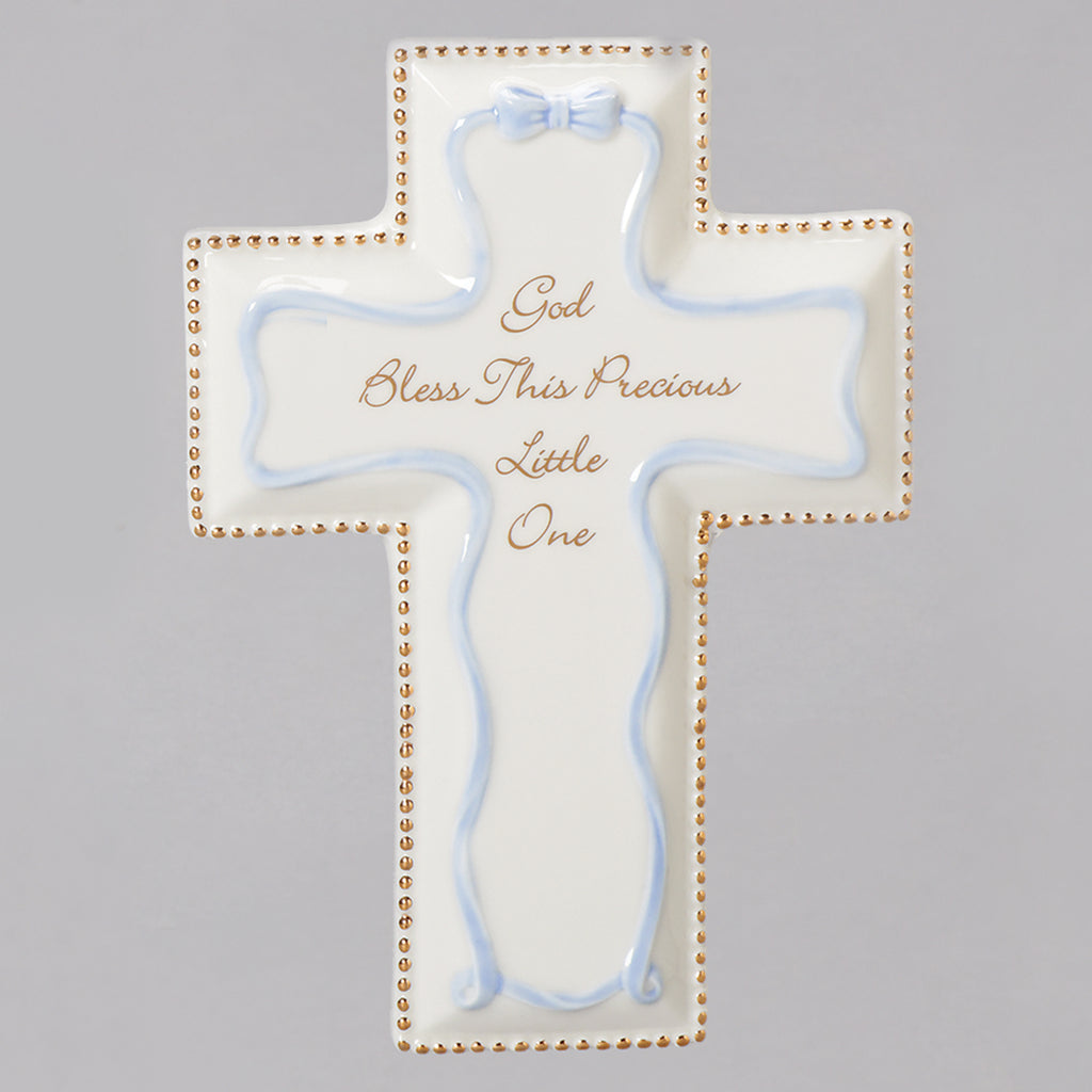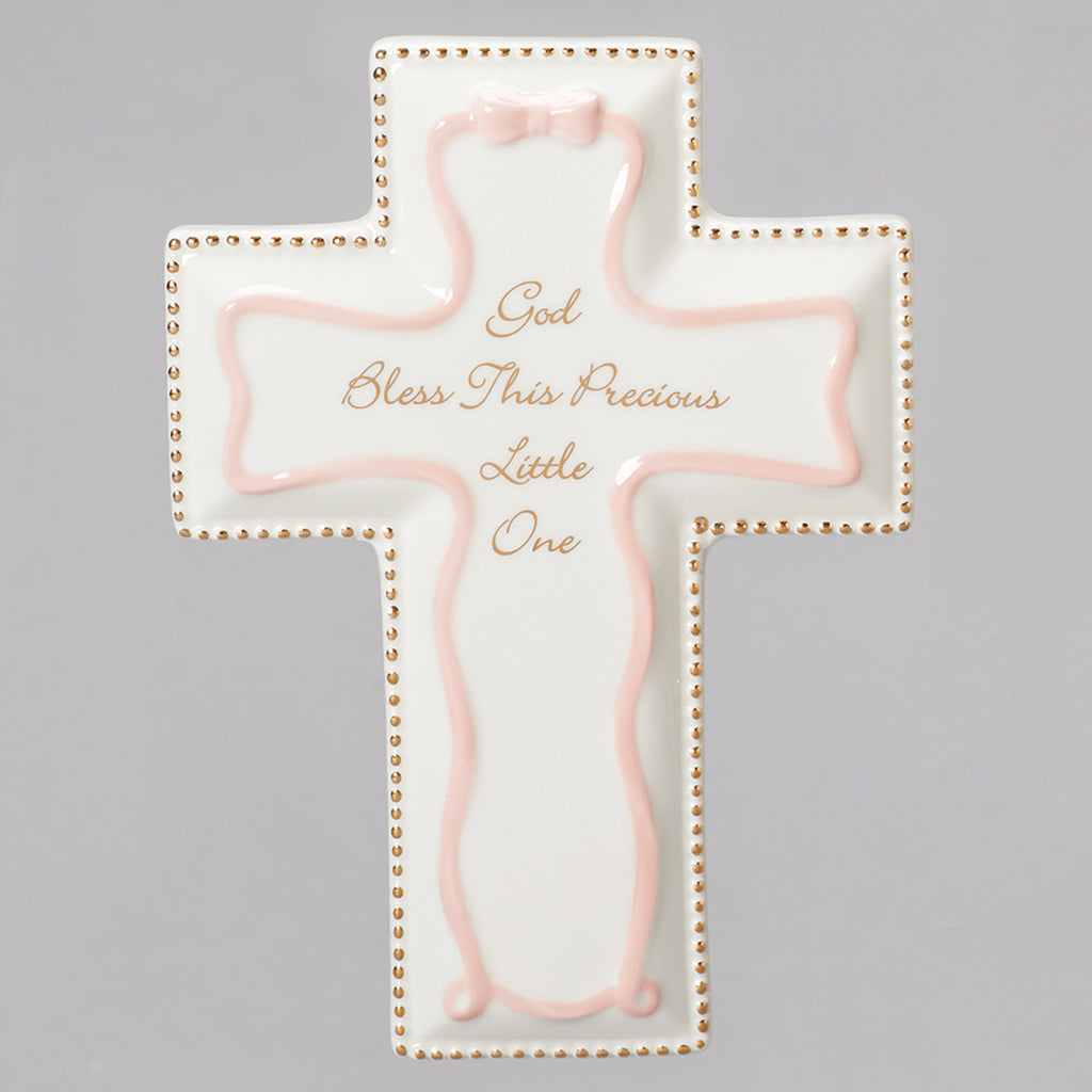 Celebrate the blessing of a new life with this elegant porcelain wall cross. Accented with delicate gold beading along the edges and a sweet bow detail at the top, it features the heartfelt inscription, “God Bless This Precious Little One.”Available in white, pink, or blue, this keepsake cross is a meaningful addition to any nursery or baptism celebration, a timeless reminder of faith, love, and God’s protection.