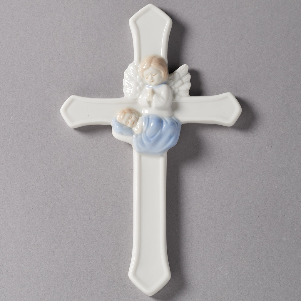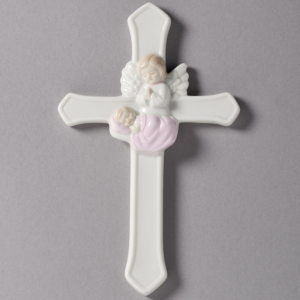 Bring gentle faith and comfort to any nursery with this elegant porcelain wall cross. Featuring a serene guardian angel tenderly watching over a sleeping infant, it serves as a touching reminder of God’s love and protection. Available with pink or blue swaddle accents, it makes a meaningful gift for baptisms, births, or dedications. A timeless keepsake that will be cherished for years to come.