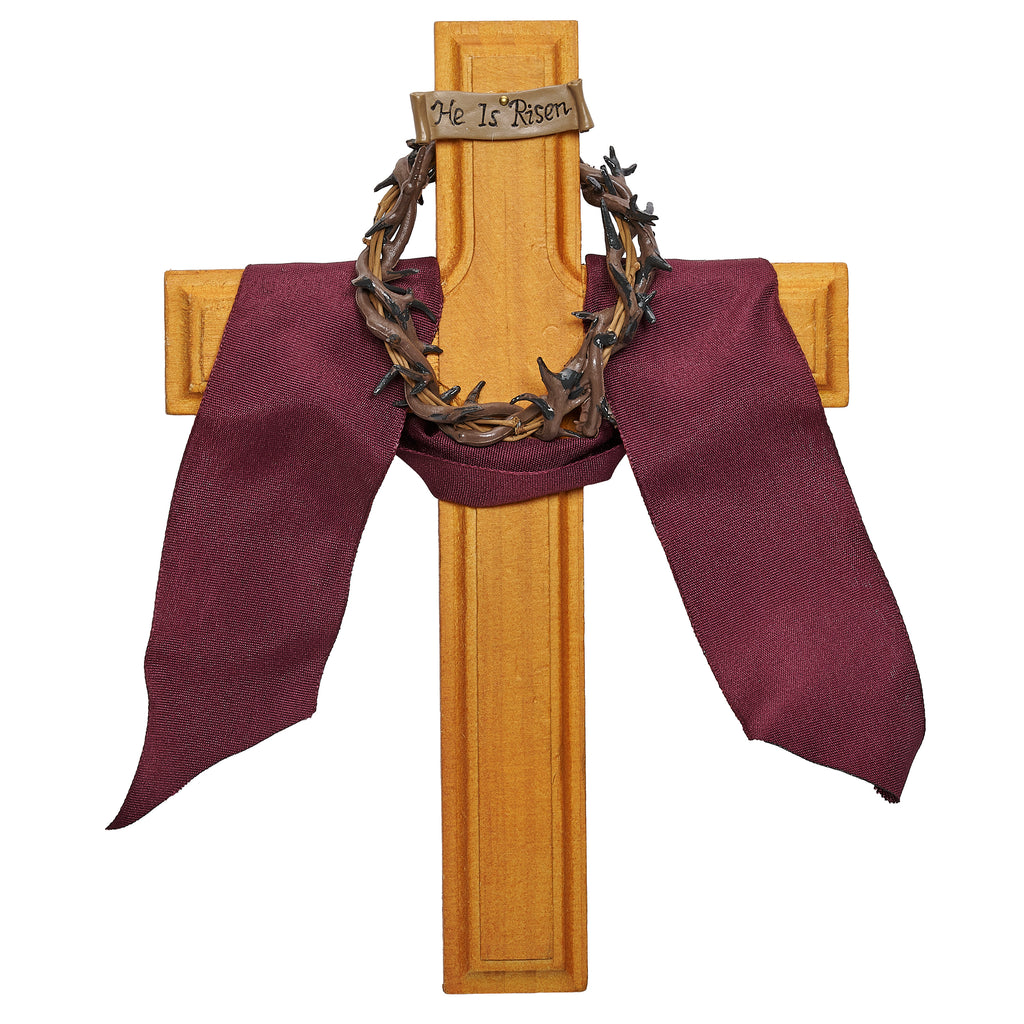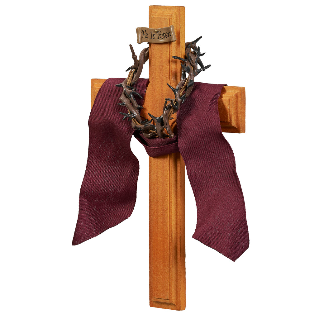 This reverent wall cross features a symbolic crown of thorns and draped burgundy fabric, echoing Christ's passion and resurrection. Crafted from wood and resin, it includes a small "He Is Risen" plaque at the top offering a message of triumph over death. Ideal for Easter or year-round inspiration, it arrives beautifully boxed and ready for gifting. A meaningful expression of unwavering faith for any home.