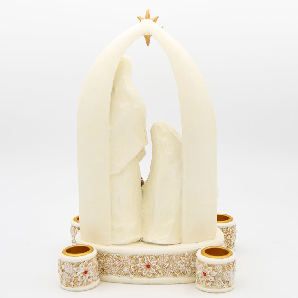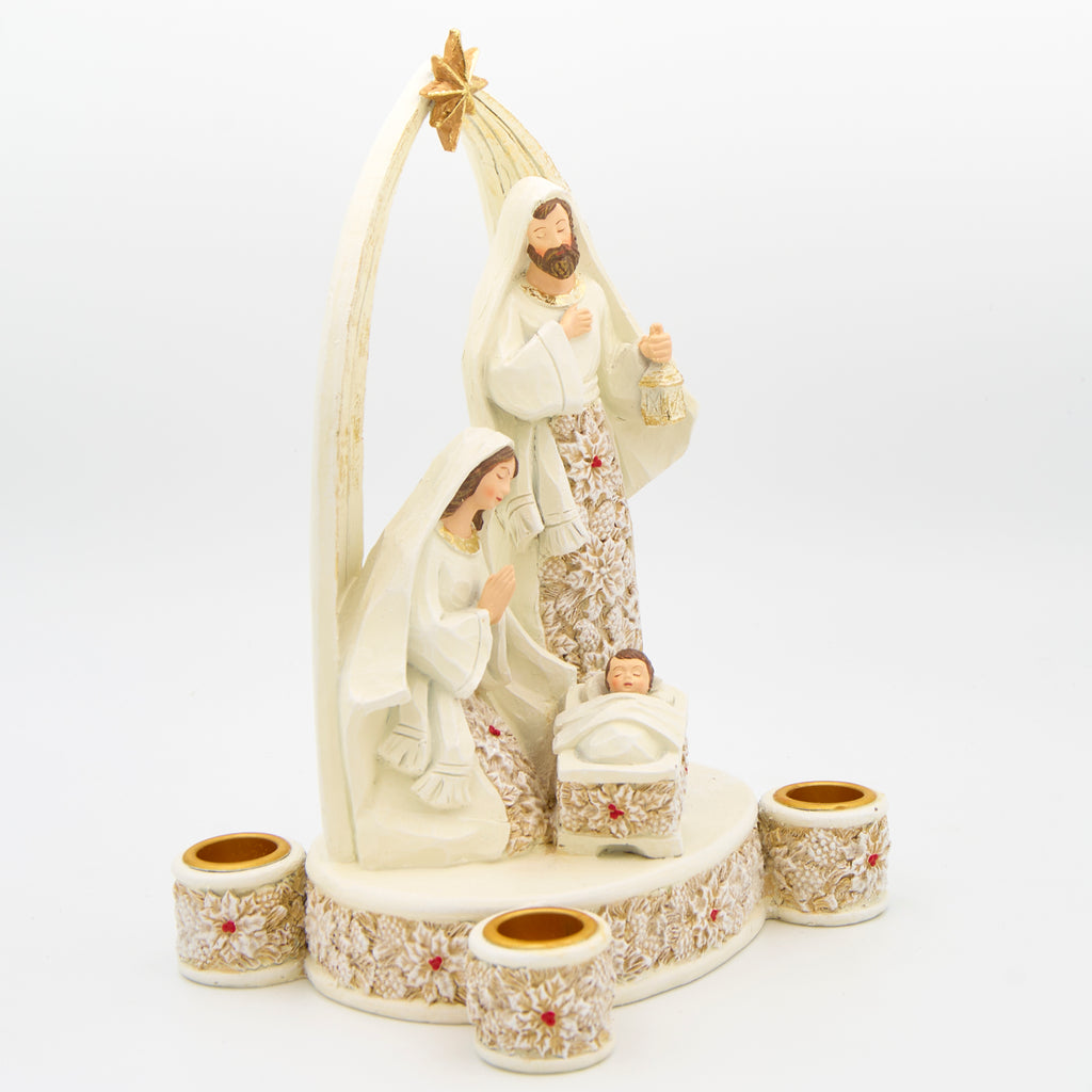 Celebrate the season of anticipation and hope with this beautifully detailed Advent candle holder. Featuring the Holy Family, Mary, Joseph, and Baby Jesus, beneath a golden star and surrounded by elegant poinsettia accents. Designed to hold four candles, it serves as a meaningful centerpiece for your Advent observance and a cherished addition to your Christmas décor.