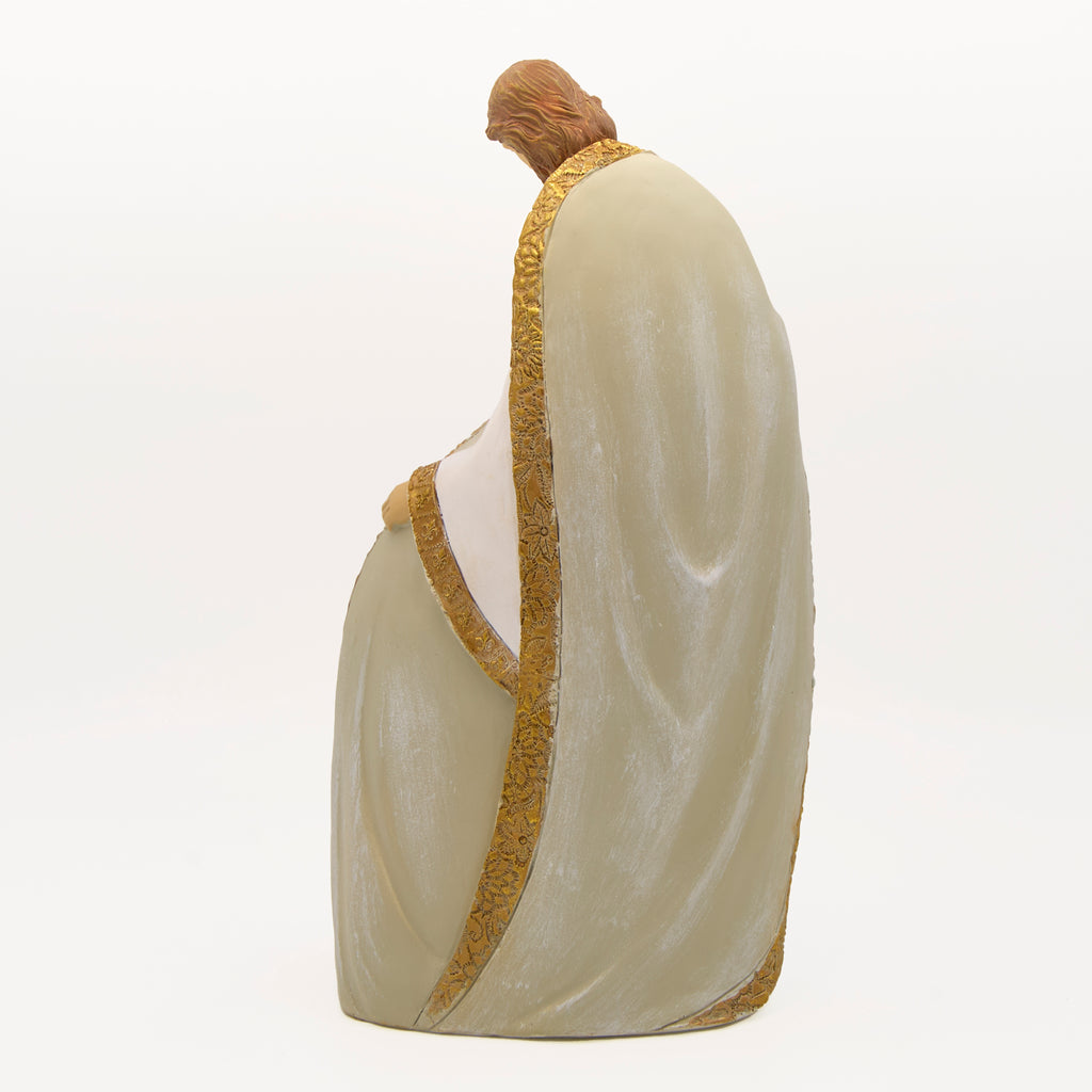 This tall version of our Holy Family figure offers an elegant, eye-catching nativity display. Sculpted in smooth white resin with ornate gold embossing on each robe, it features Joseph holding a lantern over Mary and Jesus. The larger scale and refined detailing make it ideal for mantels, entryways, or as a centerpiece in your Christmas collection.