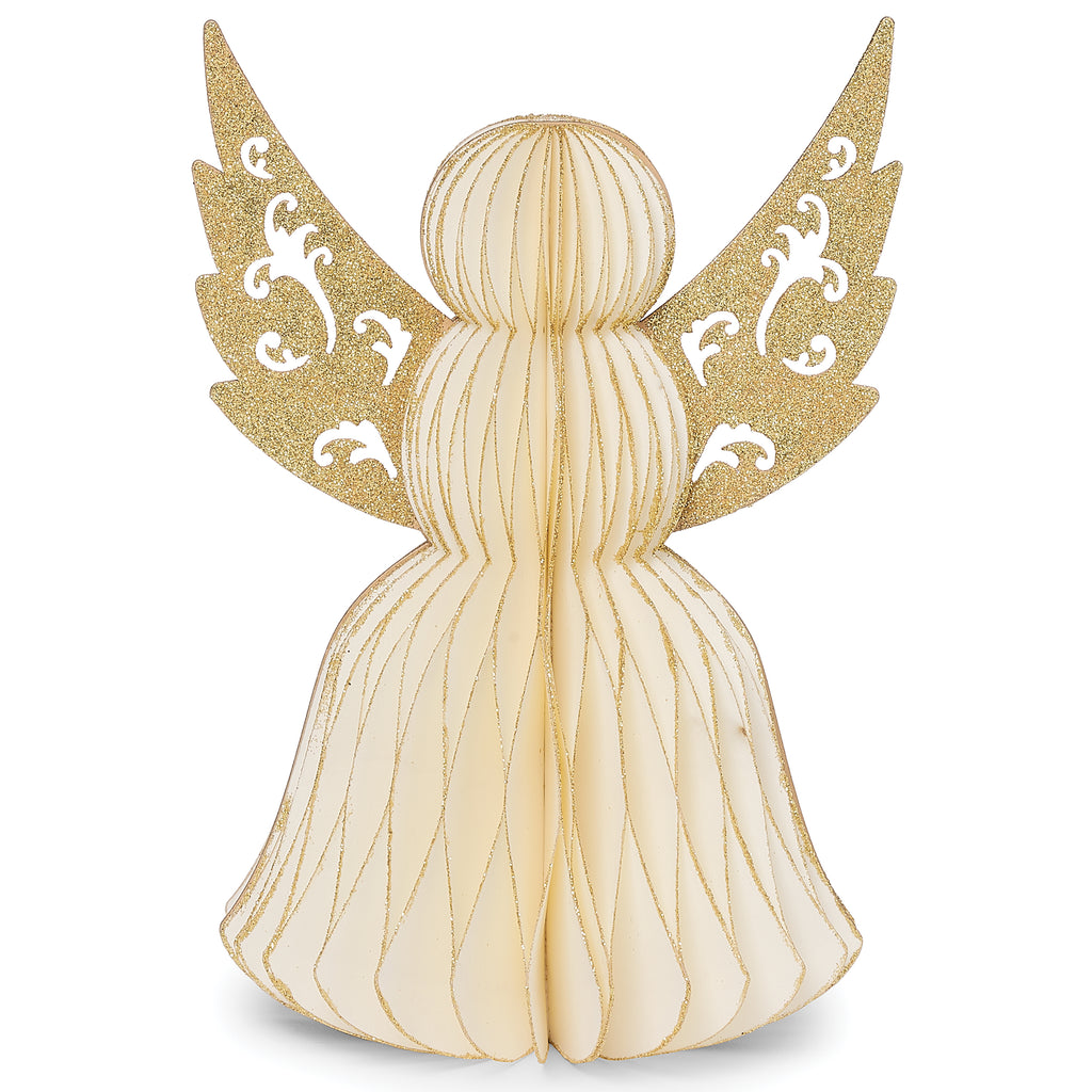This honeycomb angel adds delicate charm to your holiday decor with its classic silhouette and shimmering gold glitter wings. Crafted from high-quality paper, it easily pops open for display and folds flat for compact storage. Ideal for trees, mantels, or tabletops.