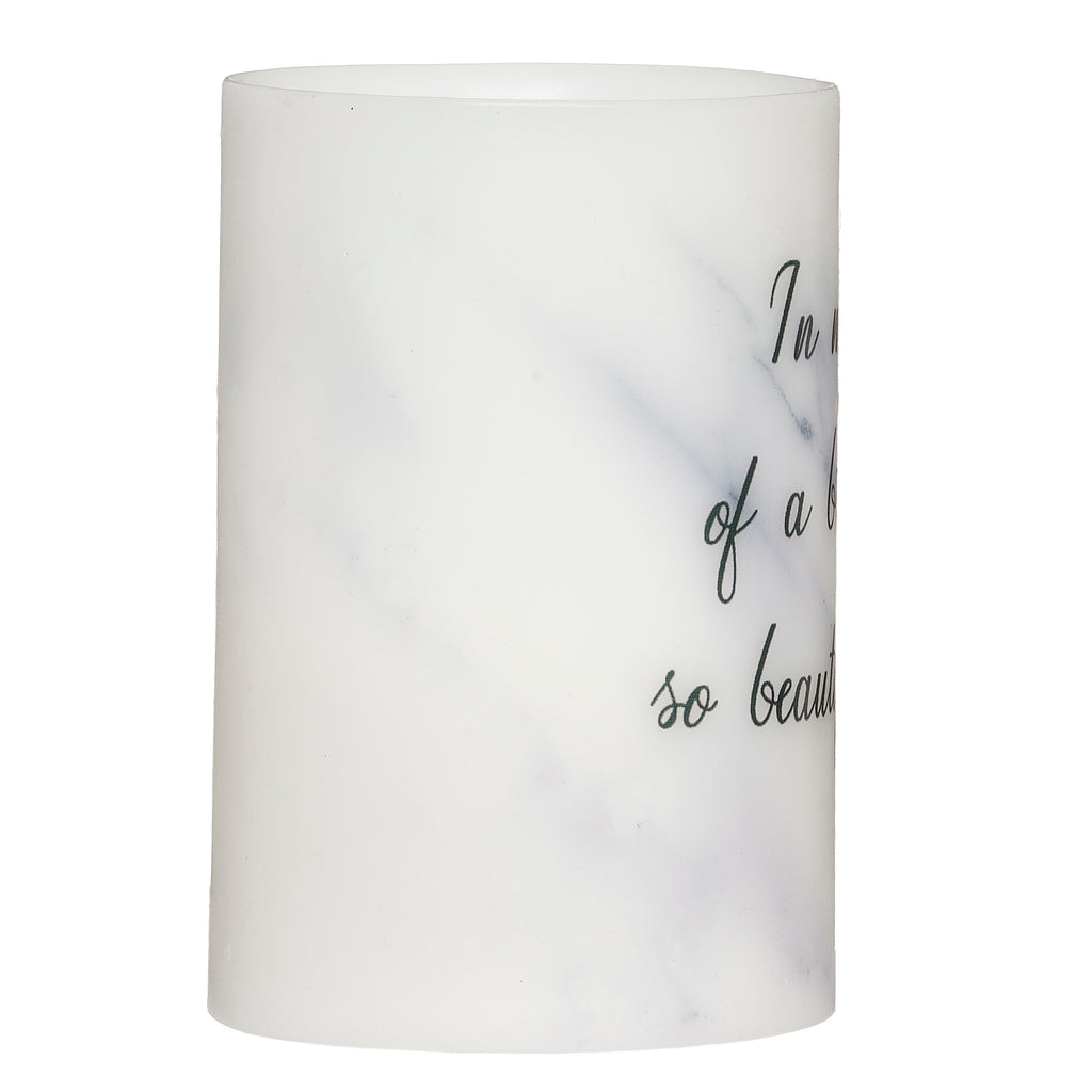 This LED memorial candle offers a gentle flickering glow and the comforting inscription: “In memory of a bright life so beautifully lived.” Crafted from real wax with a soft marble effect, it brings warmth and peace to memorial displays, prayer spaces, or quiet moments of reflection. Battery-operated for safety and long-lasting use, this candle serves as a meaningful tribute to a cherished life.