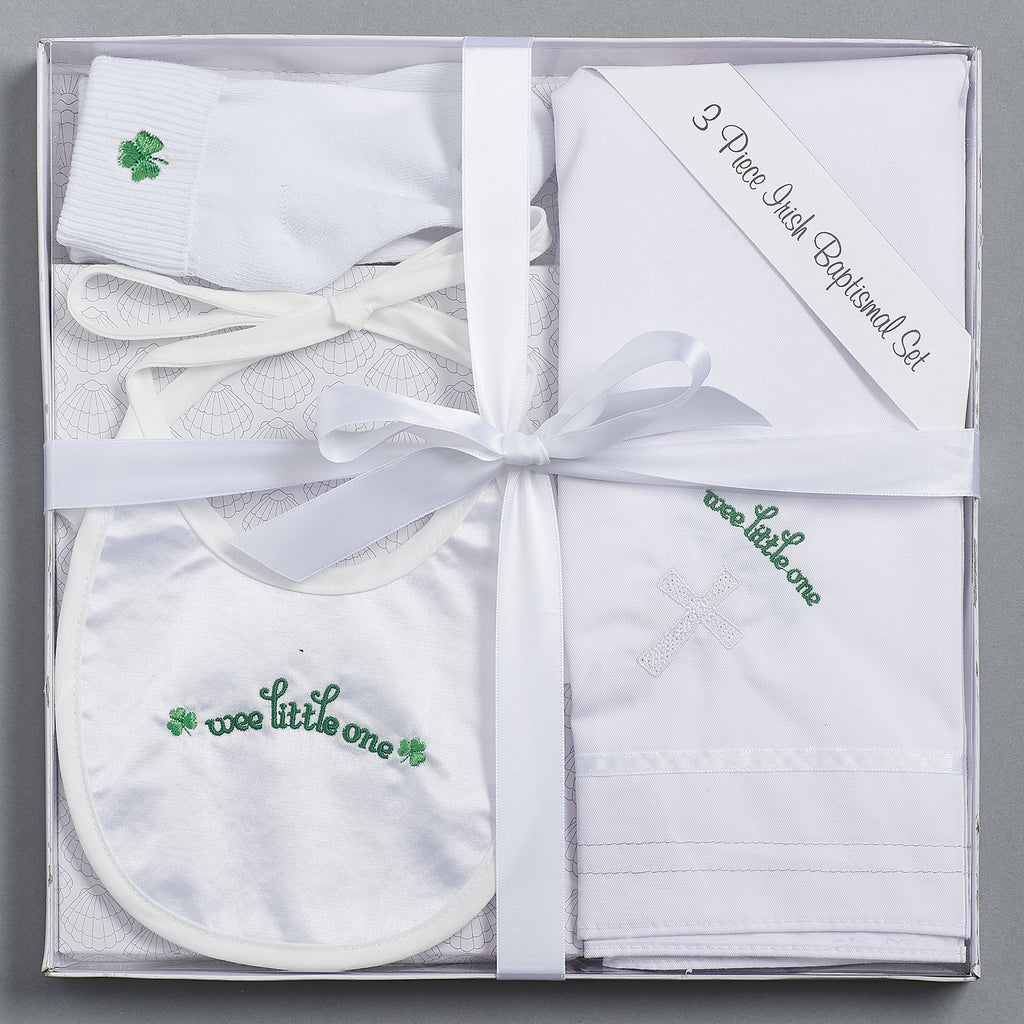 Celebrate your little one’s baptism with this meaningful Irish-themed 3-piece gift set. Each piece is embroidered with shamrock accents and the words “wee little one,” honoring heritage while blessing this sacred day. The set includes a soft white bib, a pair of socks adorned with a green shamrock, and a blanket embroidered with both a cross and shamrock detail. Thoughtfully presented in a ribbon-tied box, this set makes a heartfelt gift for parents, grandparents, or godparents, offering both beauty and keepsake value for years to come.