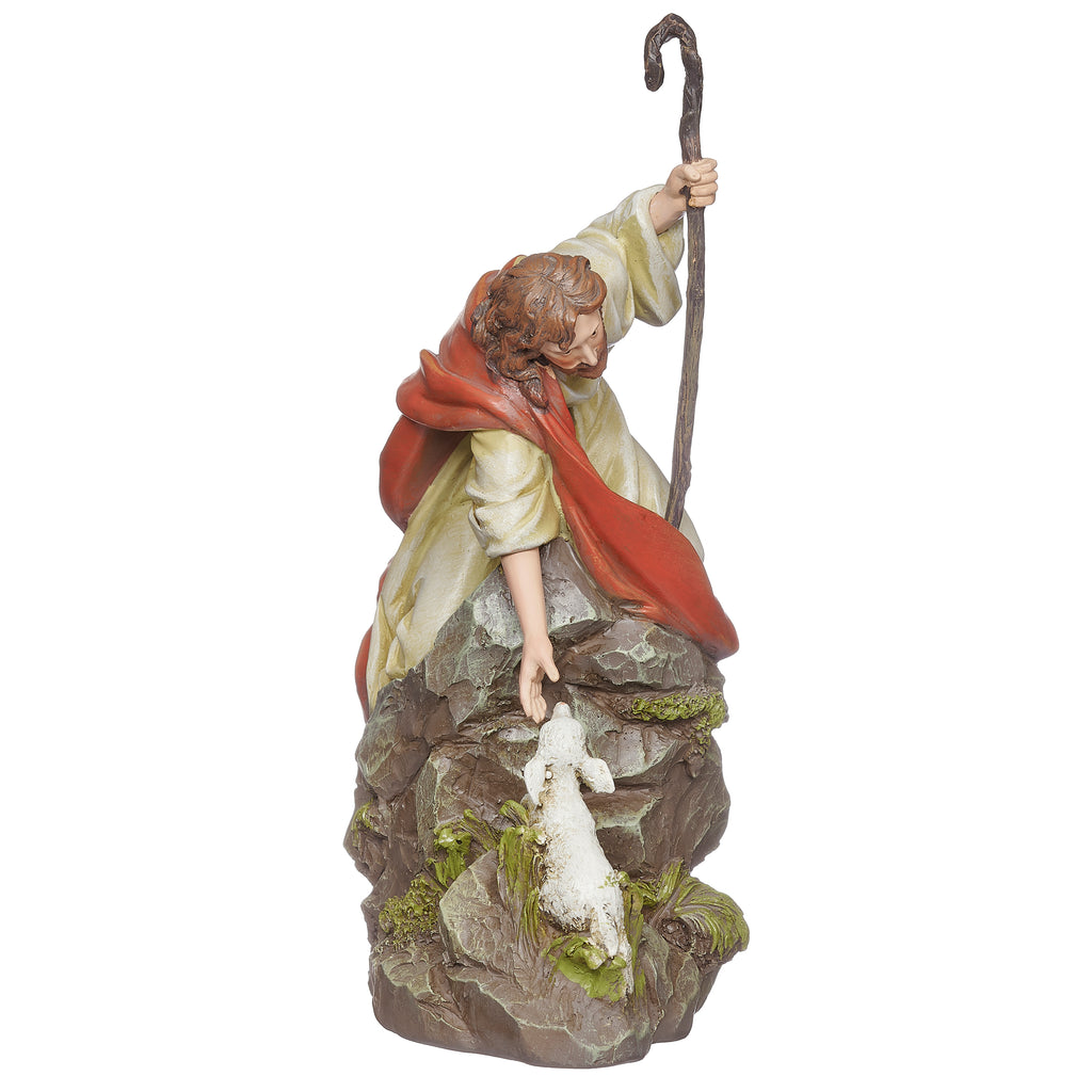 This powerful figure of Jesus with the lamb portrays Christ as the Good Shepherd, reaching down in compassion to rescue a lost sheep. Set upon a rocky ledge, the lamb gazes upward in trust as Jesus extends His hand, a moving symbol of mercy, guidance, and salvation. With lifelike detail and warm, hand-painted color, this piece serves as a beautiful reminder of His promise to seek and save the lost. Perfect for prayer spaces, classrooms, or as a meaningful gift of encouragement and faith.