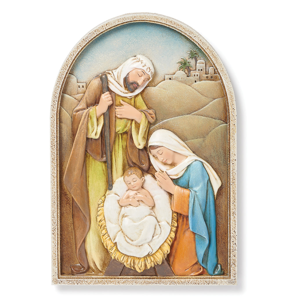This beautifully sculpted Holy Family plaque by Joseph’s Studio captures the quiet wonder of the Nativity in an arched, stone-like frame. The relief design brings depth and warmth to the scene, depicting Mary and Joseph watching over the newborn Savior with gentle devotion. Hand-painted in soft, traditional tones, this piece includes an easel back for tabletop display and a hook for hanging, allowing it to be enjoyed anywhere as a meaningful reminder of the first Christmas.