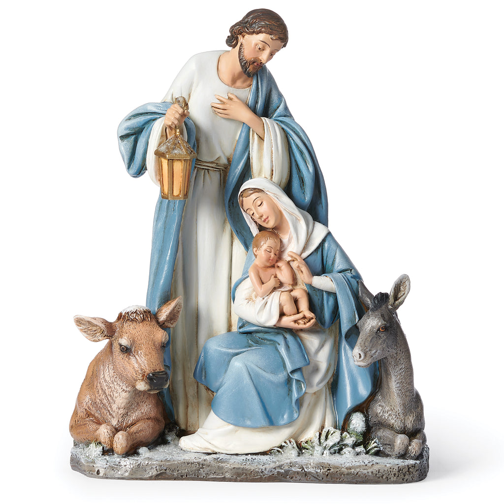 From the Joseph’s Studio Collection, this beautifully sculpted nativity figurine showcases Mary, Joseph, and Baby Jesus surrounded by an ox and donkey. Crafted from resin with soft blue and white robes, this piece adds peaceful reverence to mantels, tabletops, or prayer spaces during the Christmas season.