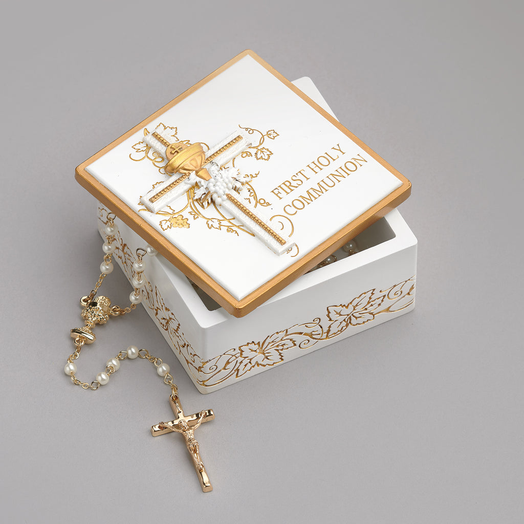 Celebrate a child's sacred day with this elegant First Communion keepsake box, beautifully crafted with intricate detailing. Perfect for storing religious mementos and treasured items, it makes a thoughtful gift to preserve memories and honor this meaningful milestone for years to come.
