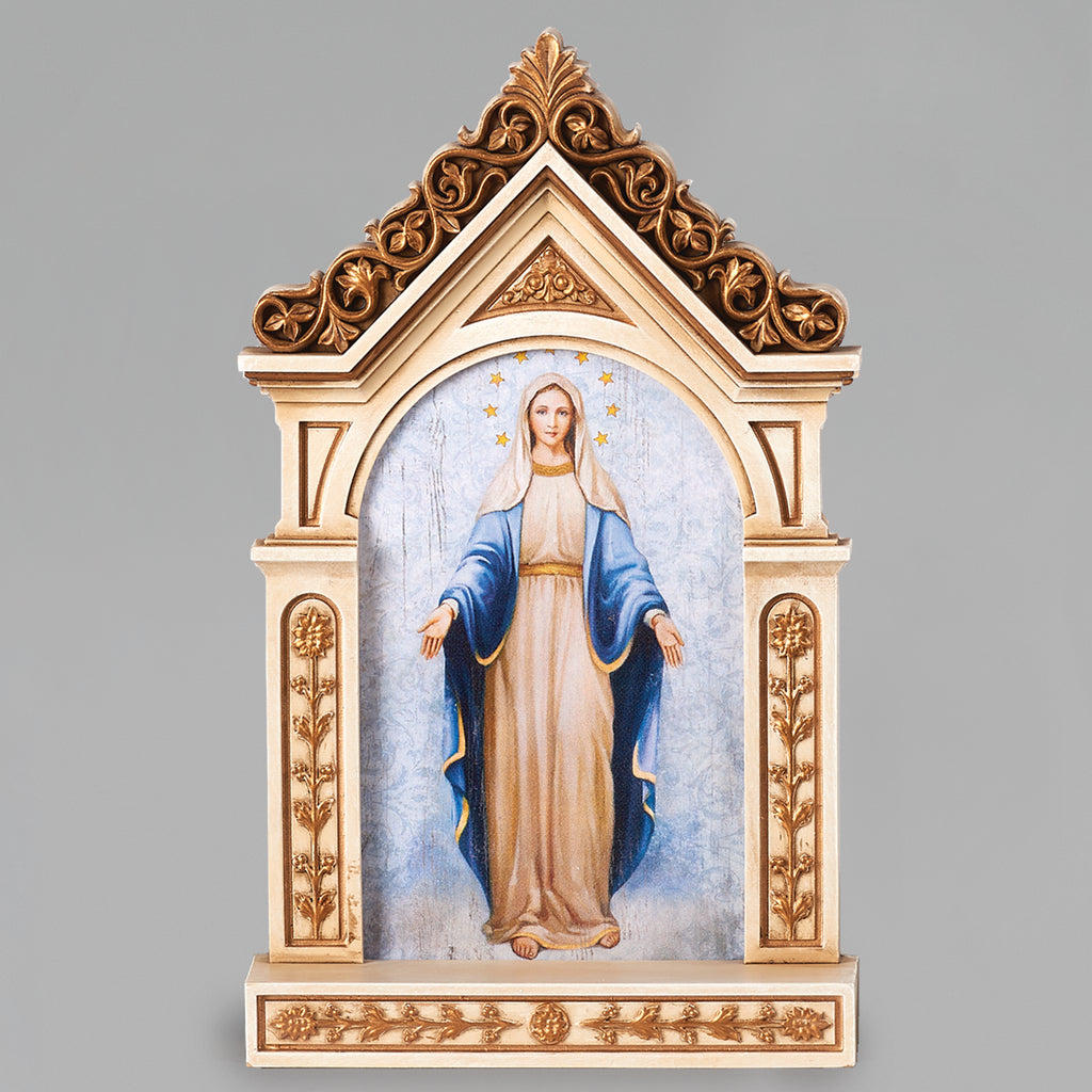 From the Joseph's Studio Collection, this tabletop plaque features Our Lady of Grace enclosed within an elegant architectural frame. Delicately sculpted with serene expression and flowing robes, it creates a peaceful focal point for prayer and reflection. Ideal for desks, shelves, or bedside devotionals.