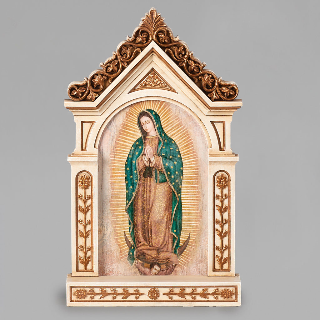 From the Joseph's Studio Collection, this tabletop plaque features a beautifully detailed depiction of Our Lady of Guadalupe framed in an ornate, cathedral-style arch. Perfect for desks, shelves, or altars, it serves as a compact yet striking reminder of Mary's love, intercession, and maternal care.