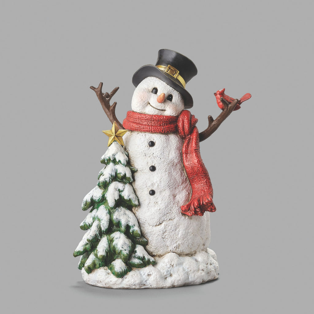 Bring cheerful holiday charm to your decor with this Joseph’s Studio Snowman with Scarf and Tree Figure. Featuring a smiling snowman dressed in a cozy red scarf beside a snow-dusted tree topped with a star and a festive cardinal, this finely detailed figure adds warmth and whimsy to any Christmas display.