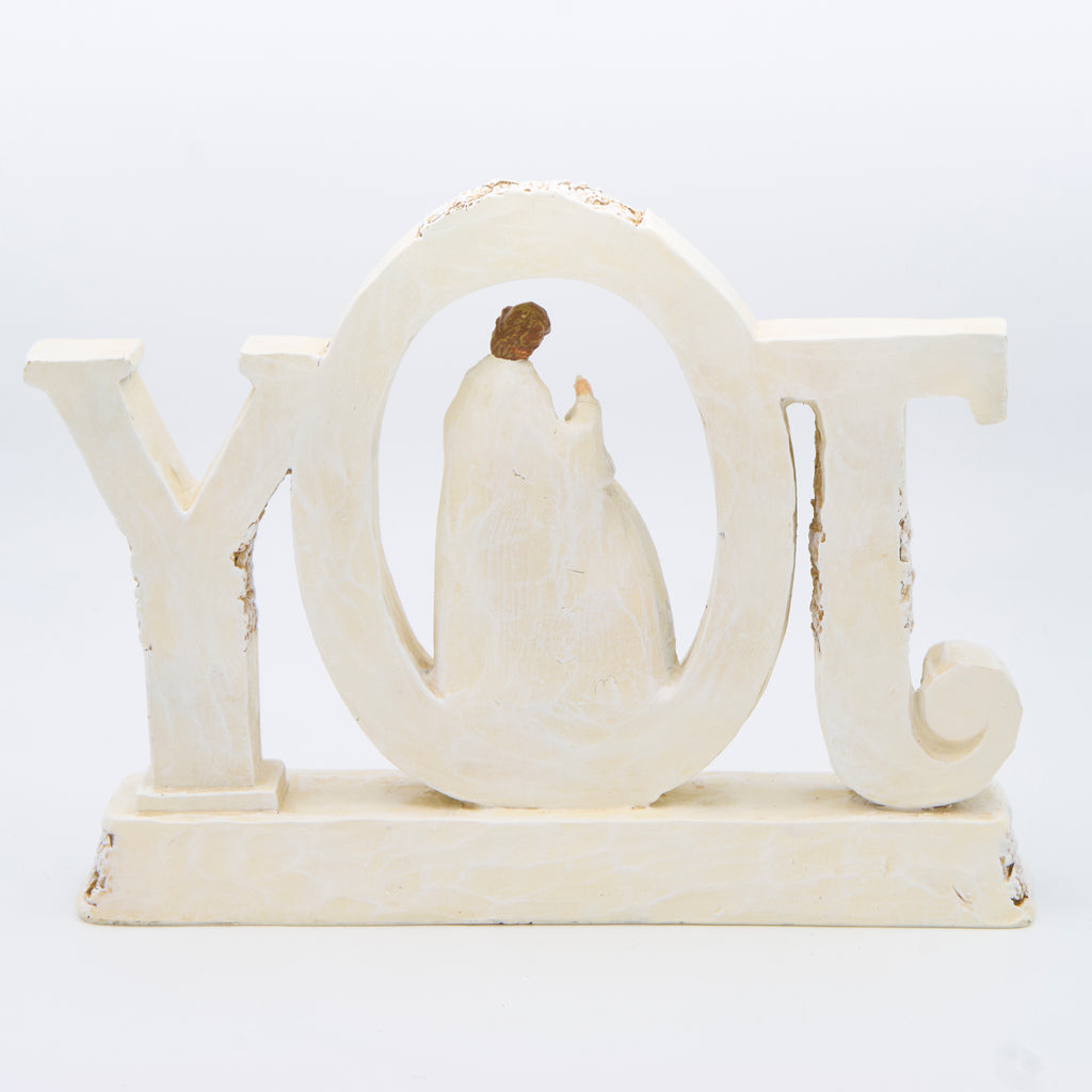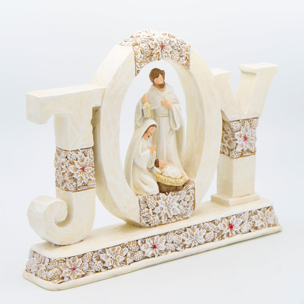 Celebrate the spirit of Christmas with this JOY Holy Family figure. This beautifully detailed resin piece features Mary, Joseph, and Baby Jesus nestled within the word "JOY" with elegant poinsettia pattern accents. A heartwarming centerpiece for mantels, shelves, or spiritual displays.
