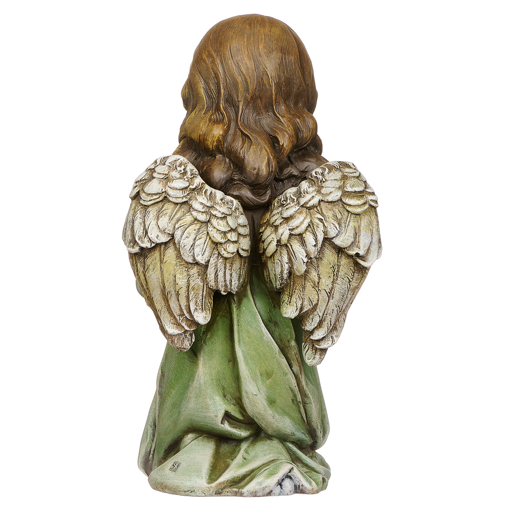 This sweet angel statue kneels in quiet prayer, gently holding a soft pink rose to her lips as if caught in a tender moment of gratitude. Her flowing sage green gown is accented with graceful folds, and her auburn curls cascade over delicately carved wings. From her serene expression to the hand-painted textures, she brings charm, warmth, and spiritual elegance to any garden or peaceful nook.
