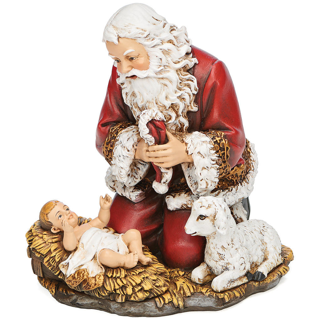 From the Joseph’s Studio Collection, this 5" figure depicts Santa kneeling in reverence beside the Christ child and a resting lamb, holding his hat in hand. Sculpted with fine detail and rich in symbolism, it serves as a meaningful reminder of the true spirit of Christmas. Perfect for mantels, shelves, or devotional holiday décor.