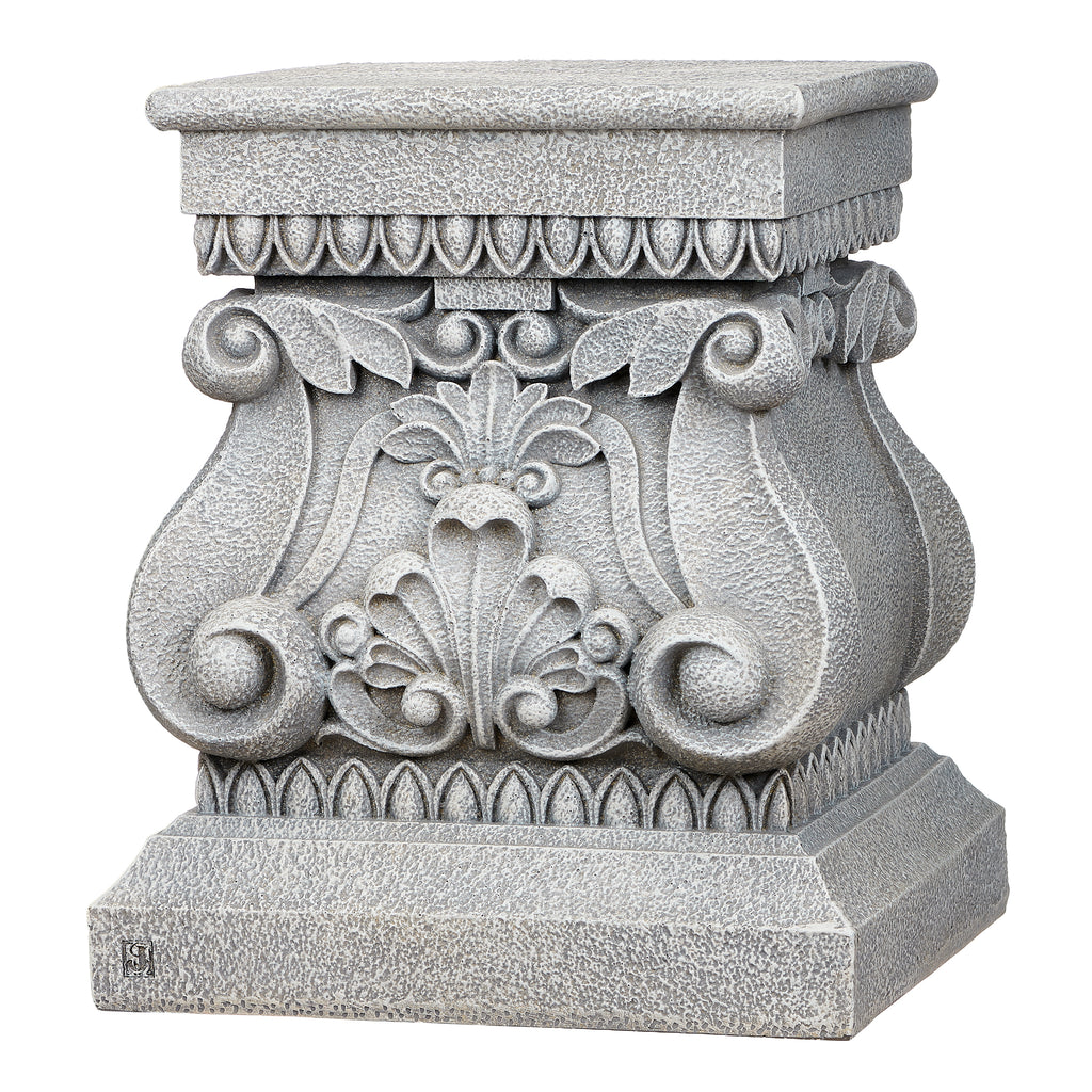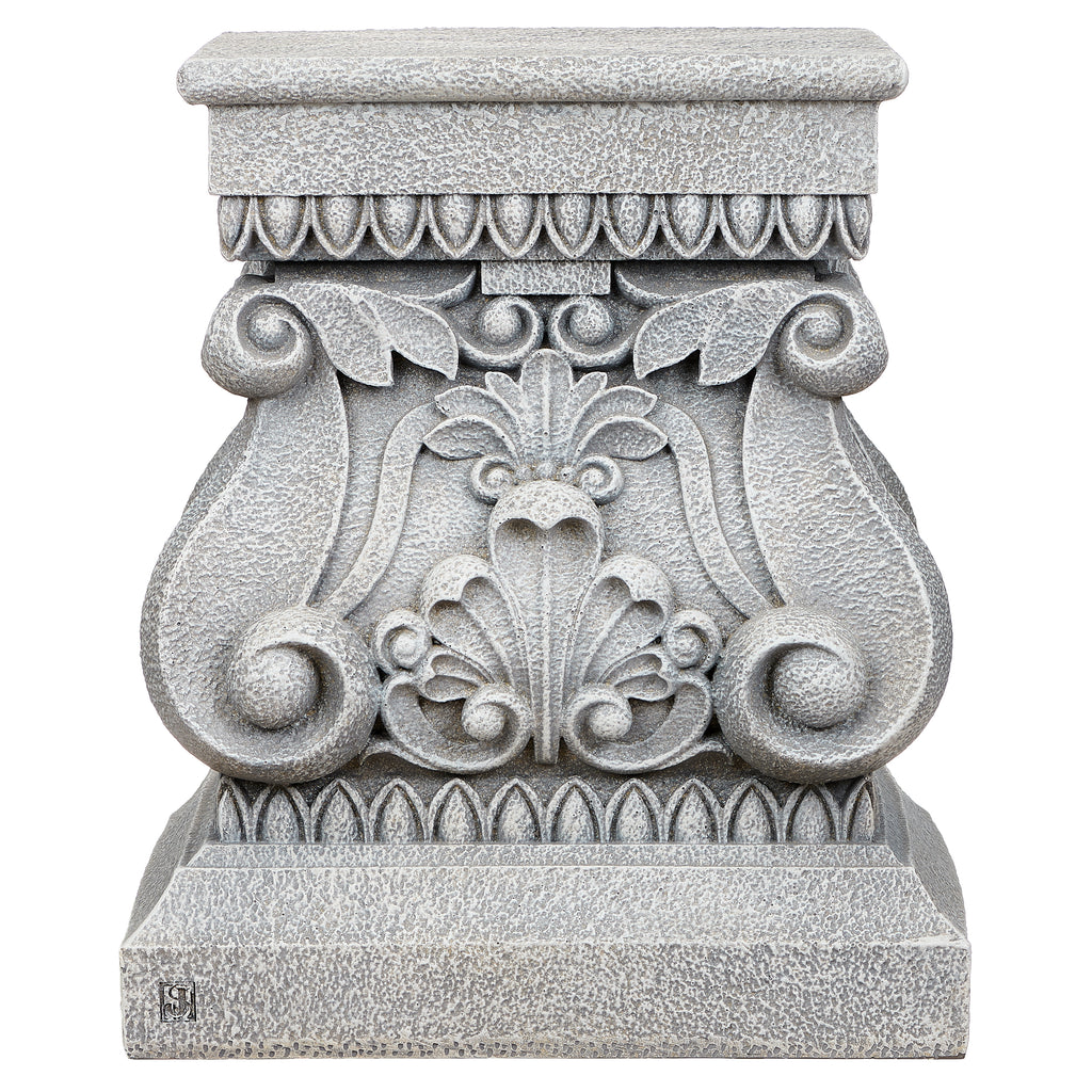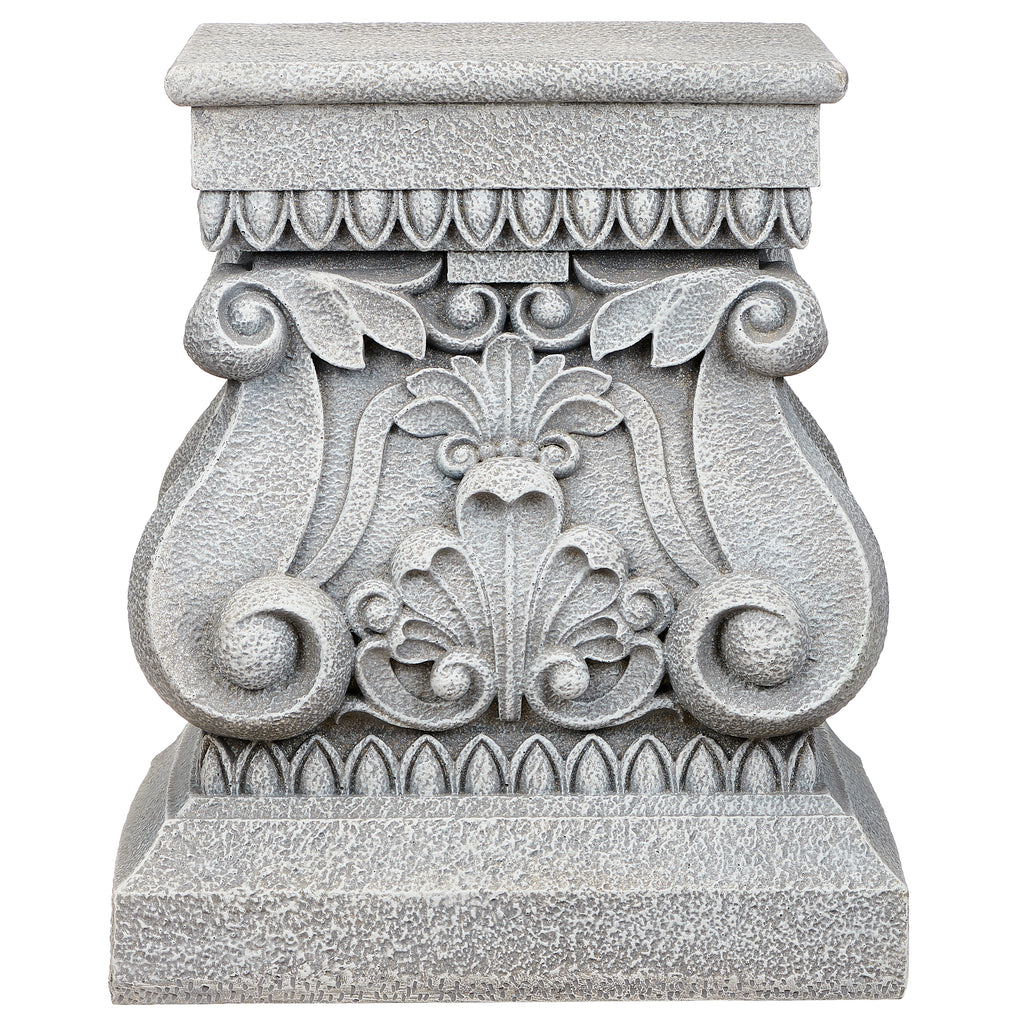 Classic design meets functional elegance in this ornate garden pedestal. Crafted with a square base, carved floral scrollwork, and textured stone-like finish, it offers a sturdy platform for displaying statues, planters, or seasonal accents.