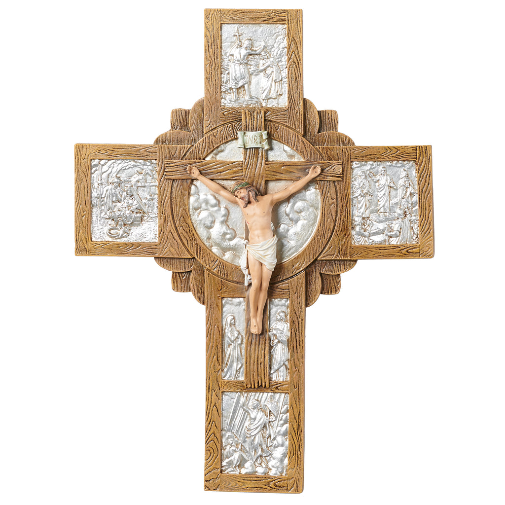 From the Renaissance Collection, this Life of Christ Crucifix features a central image of Christ on the cross surrounded by intricately sculpted scenes from His life and ministry. Each panel reflects a sacred moment, offering spiritual reflection and artistic detail in a compact, meaningful display.